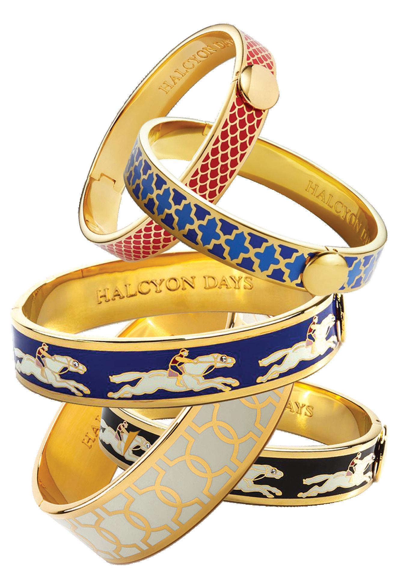 These golden enamel bangles have been handcrafted and hand-decorated in England by the Halcyon Days artisans. Their designs are destined to delight any equine enthusiast, making them winning pieces to wear to a day’s racing.