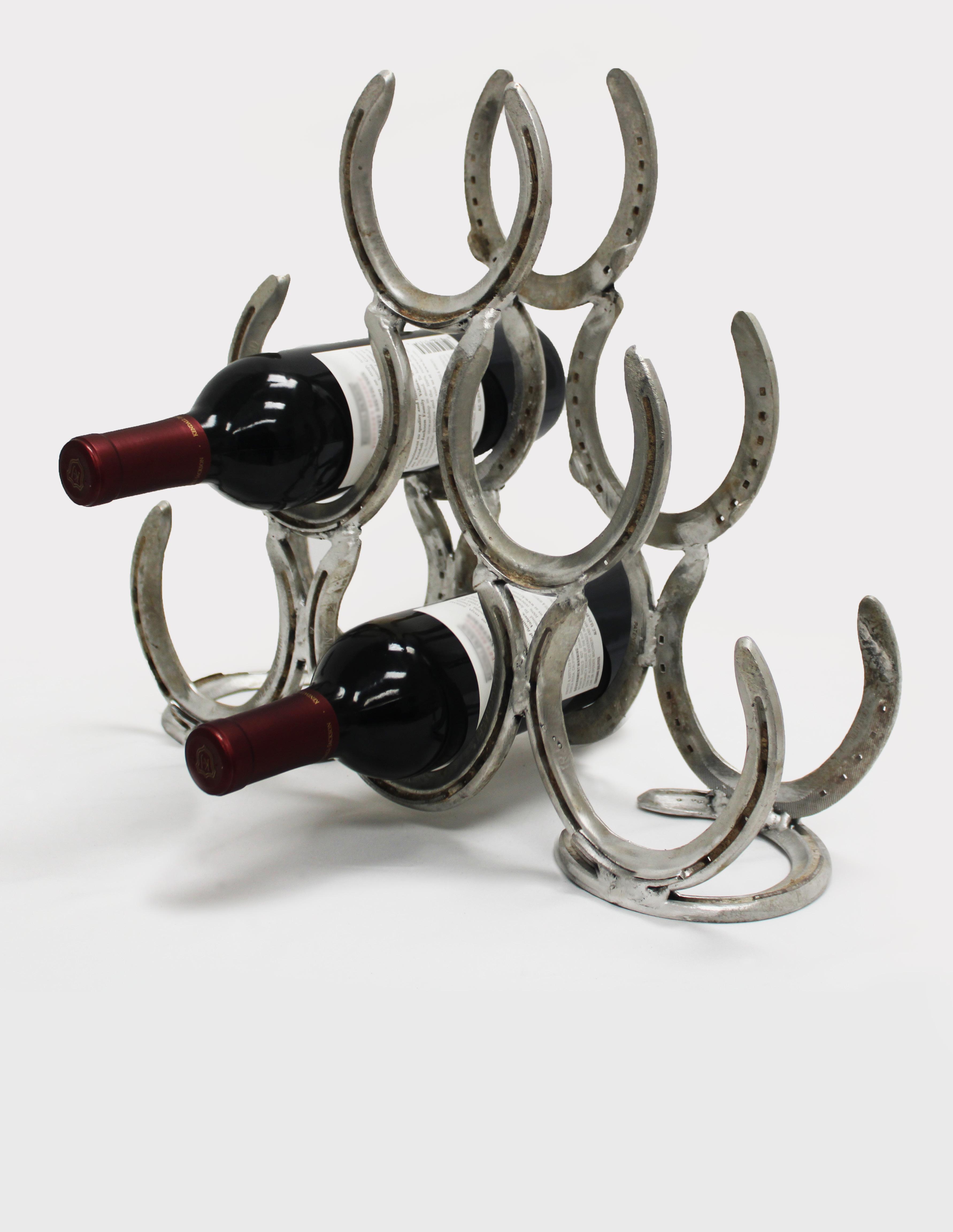 Authentically handcrafted in Lexington Kentucky by The Barrel Market. This horseshoe wine rack is made with horseshoes removed by the farrier from actively racing thoroughbred horses. The shoes have been left in their used state containing actual dirt form Keeneland Racecourse and Churchill Down Racetrack.