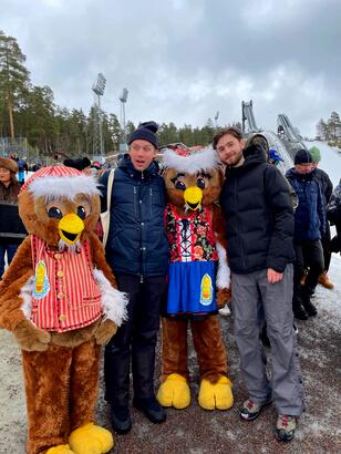 Väl på plats vid skidstadion ansluter vi till folkfesten och har utmärkt sikt över “mördarbacken” och starten. Målgången ser vi intemendetgörintesåmycketförviharfullt upp med att mingla och bli bjudna på lokala specialitetersåsom“varmchokladjägermeister” och öl (båda dessa serveras ur termos) Efteråt begersigfolkhavettillafterskin.Vifållasiniden största gympasalen jag har sett och det är först nujaginserattmängdenmänniskorsomdeltari spektaklet är enorm, flera tusen människor är här Långbord+liveband+mm =kul