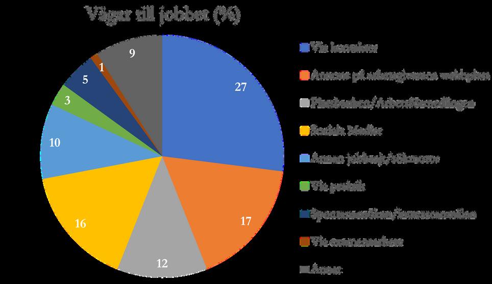 Nunärvikonstateratattmantroligenkanfåettjobbuppstår denuppenbarafråganhurmangör.Svaretsometttypvärde kontakter Såmångasom27%uppgerattdehittadesittförsta jobbgenomkontakter.Attsomstudentbyggaettkontaktnät ärnågotsombevisligenkanledatillarbetsmöjligheterefter examen Etttipsfråncoachenärattdeltapådiverse karriärsmässor,somKontaktdagarna.Extraarbeteellerpraktik understudietidenärävenbraalternativ Gällandepraktikuppgav67%avekonomernasomhaftpraktik attdeuppleverattdetvarganskaellermycketviktigtförattde skullefåsittnuvarandearbete.Dockärdetbara20%somhaft enpraktikunderstudietiden Dettaärförståeligtmedtankepå attekonomiärdenutbildningmedkanskelägstmöjligheter tillpraktikinomramenavutbildningen Blandundersökta utbildningsgruppervarekonomermedrågedenmedlägst praktikgrad Omstudenternasubstitueratpraktikmot extrajobbframgårdockinte,såintealltförstoraslutsatserbör drasavdetta.