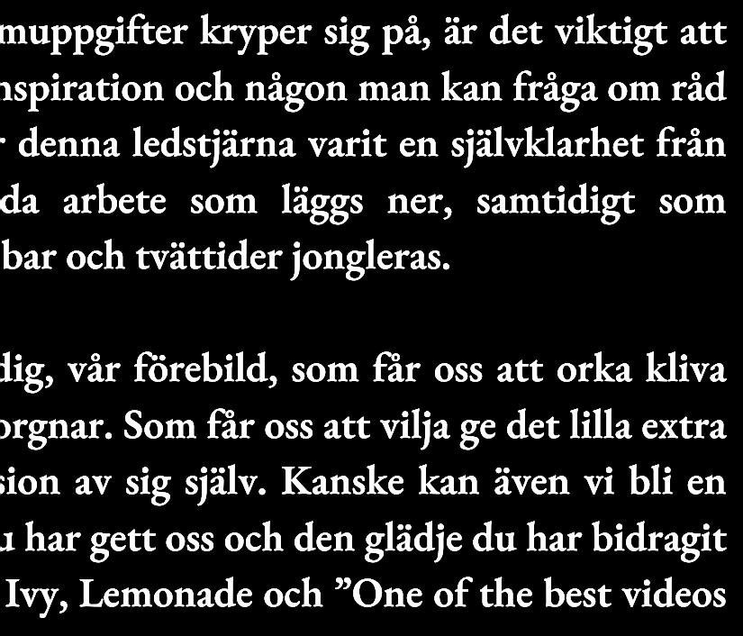 Mormor Thegirlinglory Ingenärsomduochfördetärjagevigt tacksam Tacksamförattduvisarenannanvägattgå Tacksamför attduvågar Tacksamförattfåomgesavdinsprudlandeenergi Menjagförstårattdetintealltidvaritlätt Vid15-årsåldernskrev du“I’mwantedinthisworld,butIdon’tbelong I’mtoomuch forSweden” Samtidigtuttryckerdudig“Iowntheworld”,“The futureismine”,“Icandoeverythingamancando(almost)” Det gör mig vansinnig att vissa inte förstår, men jag förstår mormor Duvardöredintid,ochdetärdufortfarande Duärtidlös Tack för att du fortsätter gå din egen väg Mormor Du är en riktig förebild