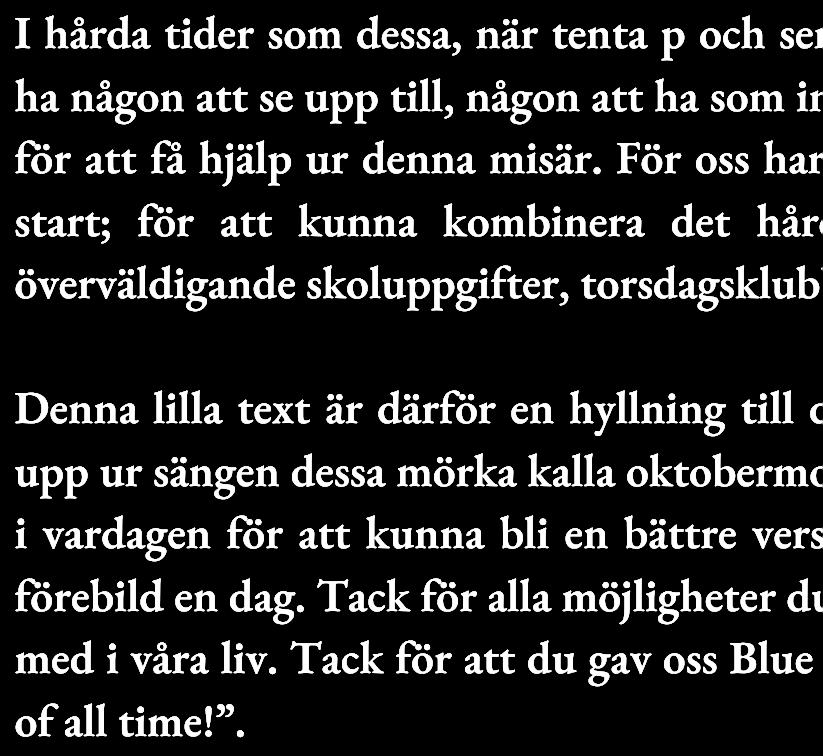 Jagsägerdetalltförsällan;tack Menetttackräckerinte Känslan för er är bortom det Vilket ord hade ens kunnat beskriva min kärlekförer?Mintacksamhet?Vilketordtäckerallt?Inget Inget ärtillräckligt Förjaglever,andasochdörförer Niärendelavmig ochjagendelaver Menjagskagemigpåettförsök Ellerinte “försök”,fördetordetgillarduintemormor “Vadåförsöka?Man görjudet!”hadedusagt Såjagska Jagskaskrivanerentusendels bråkdelavmintacksamhetförer