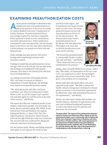 EXAMINING PREAUTHORIZATION COSTS more precise technique to determine nonreimbursed costs of preauthorizations to physician practices is the focus of a study by Upstate Medical University’s Department of Family Medicine. Preauthorizations (PA) are increasingly required by insurance companies before payment is made for tests, medications, and other clinical services. Other studies have examined PA costs retrospectively, but the Upstate group is the first to use real-time data collection in a dozen primary care practices in New York and Pennsylvania.