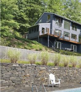 Lakeside: Sleek modern with lake access to Round Pond, 5 acres, Rhinebeck. 2,770 SF, 3 bedroom, 2.5 bathroom, 2 car garage, outdoor patios and lounging.