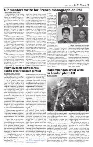 Manuel Victor J. Sapitula, who was assistant professor at the Department of Sociology, College of Social Sciences and Philosophy, and is currently a doctorate student in Sociology at the National University of Singapore; Dr. Elisabeth Luquin, senior lecturer in Filipino and Philippine literature at the National Institute of Oriental Languages and Cultures in Paris, who is currently an exchange professor in UP Diliman; and Dr. JC Gaillard, Associate Professor at the School of Environment of the University of Auckland in New Zealand, who is a visiting professor at UP Diliman. Dean Tan, who was invited to deliver a message during the launch of the monograph last March 13 at the newlyrenovated Alliance Francaise de Manille in Makati, considers it an honor that UP people are able to contribute to the publication. “I am really hopeful that this [monograph] would give more attention to the efforts of the French to understand the Philippines,” he said. He added that French Ambassador to Manila Gilles Garachon explained during the launch that the monograph basically targets the French people, especially those interested in Southeast Asia, particularly the Philippines. Tan also recalled his meeting with the French commercial attaché, who told him that the biggest French company in the Philippines, Teleperformance, employs UP