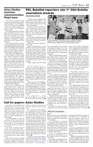 Call for papers: Asian Studies Asian Studies, a peer-reviewed journal published twice a year by the Asian Center, UP Diliman, is looking for original contributions in the form of research articles (social sciences, humanities, and/ or culture), commentaries and documents, reviews (books, films, events, music, emedia, etc.), poetry and short fiction, and travel narratives. Consult the guidelines for content and submissions at http://journals.upd.edu. ph/index.php/asj. Send manuscripts to the editor in chief at upasianstudies@gmail. com. The journal welcomes submissions all year round. One of the pioneering journals of its kind in Asia, Asian Studies offers a critical and multidisciplinary forum where scholars, practitioners, researchers, and activists on Asia can dissect various issues that impact Asian societies and their peoples. Since 1965, the journal has published the works of (now) renowned scholars, both foreign and Filipino, including Cesar AdibMajul, Juan Francisco, Benedict