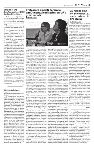 The UP System named 21 new UP Scientists in rites held last December 18 at the Executive House in UP Diliman, bringing the total of UP professors and researchers given the much-coveted distinction to 102. Twenty others who have previously joined the elite club regained their Scientific Productivity System (SPS) standing. The rank of UP Scientist is effective for three years, hence the new batch case will hold the distinction during the period 2012-2014. The conferment of the title comes with yearly monetary rewards of P120,000 for Scientist I, P144,000 for Scientist !!, and P180,000 for Scientist III. T he UP Scientists must remain productive within the system’s standards to maintain the title, or must surpass themselves to qualify for a higher title. The SPS, given every year, is now on its third cycle after its approval by the Board of Regents on August 26, 2005. Scientific productivity is evaluated based on scientific publications in refered reputable scientific journals and books, peer-reviewed technological outputs, and scientific and professional standing in the international science community. Named UP Scientist I were Professors Percival Amoro, Evangeline Amor, Clarissa David, Laura David, Christine Hernandez, Dennis Mapa, Maria Lourdes McGlone, Alfred Pawlik, Jonas Quilang, and Ronald Villanueva, all from UP Diliman; Inocencio Buot Jr., Cleofas Cervancia, Maribel Dionisio-Sese, Victor Ella, Merdelyn Lit, Teodoro Mendoza, and Oscar Zamora from UP Los Baños; and Annabelle Campos and Liberato Laureta Jr. from UP Visayas. Professors Eric Galapon, Marie Antonette Meñez, and Fernando Siringan, also all from UP Diliman, retained their title. Prof. Cynthia Hedreyda of UP Diliman was named UP Scientist II. Professors Windell Rivera and Cesar Villanoy from UP Diliman, and Damasa Macandog and Conrado Valdez from UP Los Baños retained the title UP Scientist II. Prof. Perry Ong of UP Diliman was named UP Scientist III. Professors Porfirio Aliño, Rhodora Azanza, Erniel Barrios, PAGE