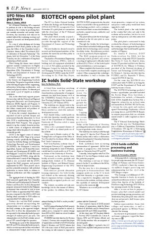 The UP Los Baños National Institute of Molecular Biology and Biotechnology As a National University, UP is expected (UPLB-BIOTECH) inaugurated last to perform its role as the leading research November 29 a pilot plant, in conjunction university in the country by producing firstth rate scientific researches and creative works. with the observance of the 8 National However, this herculean task will not be Biotechnology Week. The plant which recently acquired a realized without the continuing assistance and support of research and development (R&D) number of new equipment, was made possible through the support of the partners. As a way of acknowledging and showing Department of Science and Technology gratitude to UPD’s R&D partners in the past (DOST). The new facility was deemed crucial to years, the Office of the Chancellor hosted a Christmas dinner called “Pasasalamat 2012: research and development initiatives of the A Celebration of Research Partnership.” The institute, the university and other public or dinner, held last December 7 at the Balay private institutions. Tsanselor, was also a celebration of long-term The plant has a Fermentation Engineering partnership in R&D pursuits. Service Laboratory (FESL), with its Fêted during the dinner were national building and old equipment rehabilitated agencies namely: Commission on Higher at a cost of P25 million provided by the Education (CHED), Department of Philippine Council for Industry, Energy Agriculture (DA), Department of Energy and Emerging Technology Research and (DOE) and Department of Science and Development (PCIERD) under the DOST. Technology (DOST). According to Dr. Fidel Rey Nayve, CHED’s R&D program with UPD is the Science and Engineering Graduate Scholarship. The grant is for graduate students in the following discipline clusters: engineering, Imee Su Martinez, Ph.D. information technology, mathematics, and A Solid State workshop involving natural and physical sciences. Its ultimate goal intensive lectures on the synthesis, is to create a pool of experts in academic characterization, and properties of inorganic institutions. materials was held from January 14-16 at DA, on the other hand, supports projects the CHEMREZ Seminar Room in the that are in line with the National and Regional New Teaching Building of the Institute of Integrated Research and Development Chemistry (IC), UP Diliman (UPD). Extension (RDE) Agenda and Program. It The workshop was deemed vital to the also provides funding support to researches that address current needs and problems of faculty and students of UPD, particularly tthose involved in solid-state materials the agriculture and fisheries sectors. To lessen the country’s dependence on development research. Prof. Arnold Guloy, a noted professor imported oil and to provide cheaper and in solid-state chemistry, currently graduate environment-friendly alternatives to fossil chair of the Department of Chemistry, fuels, DOE is implementing the long-term University of Houston acted as main Alternative Fuels Program. This program intends to tap the country’s domestic produce resource speaker. Guloy is also a prominent alumnus of as viable sources of indigenous renewable the IC, as well as an adjunct professor of energy, which will be the pillar of our country’s the institute. sustainable growth. Guloy came to Manila courtesy of the DOST is the biggest source of external Visiting Professor Program of the Office of funds for R&D at UPD. Three of its sectoral planning councils, specifically the Philippine Vice-President for Academic Affairs under Council for Industry Energy and Emerging Prof. Gisela Concepcion. Prof. Leon Payawan, academic chair of Technology Research and Development the Inorganic Division of IC, organized the (PCIEERD), the Philippine Council for Agriculture, Aquatic and Natural Resources workshop, along with Dr. Imee Su Martinez, Research and Development (PCAARD) and a newly hired associate professor of IC, and the Philippine Council for Health Research an alumna of the University of Houston. Participants in the workshop were and Development (PCHRD), along with the National Research Council of the Philippines, faculty, research associates, graduate and which is also associated with the DOST, undergraduate students of IC, National support the R&D programs and projects Institute of Physics, and Material Science implemented by UPD. These projects aim to Engineering Department of the UPD produce patentable inventions with industrial College of Engineering. applications in various fields, in addition to Such exercises provide alternative academic publications and other copyrighted learning experiences for both faculty works. and students in the university, allowing The aggregate level of funding for UPD them to experience lectures coming from R&D increased significantly, Vice Chancellor internationally recognized professors and for Research and Development Dr. Benito M. scientists. Pacheco said. From 2011 to 2012, the reported The students can imbibe not only new programs and projects funded by the Philippine knowledge, but also the manner of delivery government were estimated to total at more of the speakers. In addition, these types than P1 billion or approximately P502 million per year, compared to the 2005 to 2009 total funding which amounted to P595 million or approximately P120 million per year. Pacheco also said that R&D partners internal funding for R&D is made possible,” graciously allowed incorporating the said Pacheco. administrative cost or indirect costing for In 2012, internal funding for R&D projects the R&D activities in the approved budgets. through OVCRD is projected to exceed 21 From 2011 to 2012, the administrative cost million pesos, compared to annual average incorporated to the externally funded projects from 2005 to 2010, which was about 16 million averaged 26 million pesos per year. The pesos, he added. administrative costs for R &D activities are not PCIE