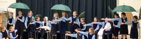 UBC Presenters handing over to Fergus Walsh Multi view from Jubilee studios. Showing Fergus in Studio 1, Aisling and Lily in Studio 2, Children in the hall. Fergus introduced a pre-record of his team before moving to the hall seamlessly – action shot of the transition!Forms 3 and 4 gave us a wonderful flavour of the Easter story, by telling a poignant legend of three trees. The story follows the journey of the trees when they are cut down. At first, they are disappointed that they are only going to be made into a feed trough, a fishing boat and planks. In fact, the trees become something special in Jesus’s life. As we reflect on this lovely story of the three trees, the feed trough becomes the manger, the fishing boat carries Jesus in the violent storm and the planks become the cross. Something ordinary into something beautiful, something weak into something strong and something forgotten into something significant. Form 4 performed with great confidence and impressive acting skills, with Form 3 as a supporting choir. The Staff and Middle Choirs sang beautifully. All of the singing was truly touching, and many tears of joy were shed by the audience, whether present in the hall or online, where 227 people in 9 countries including Spain, Slovakia, USA, Brazil, UAE, Malta, Italy and Finland joined the assembly.