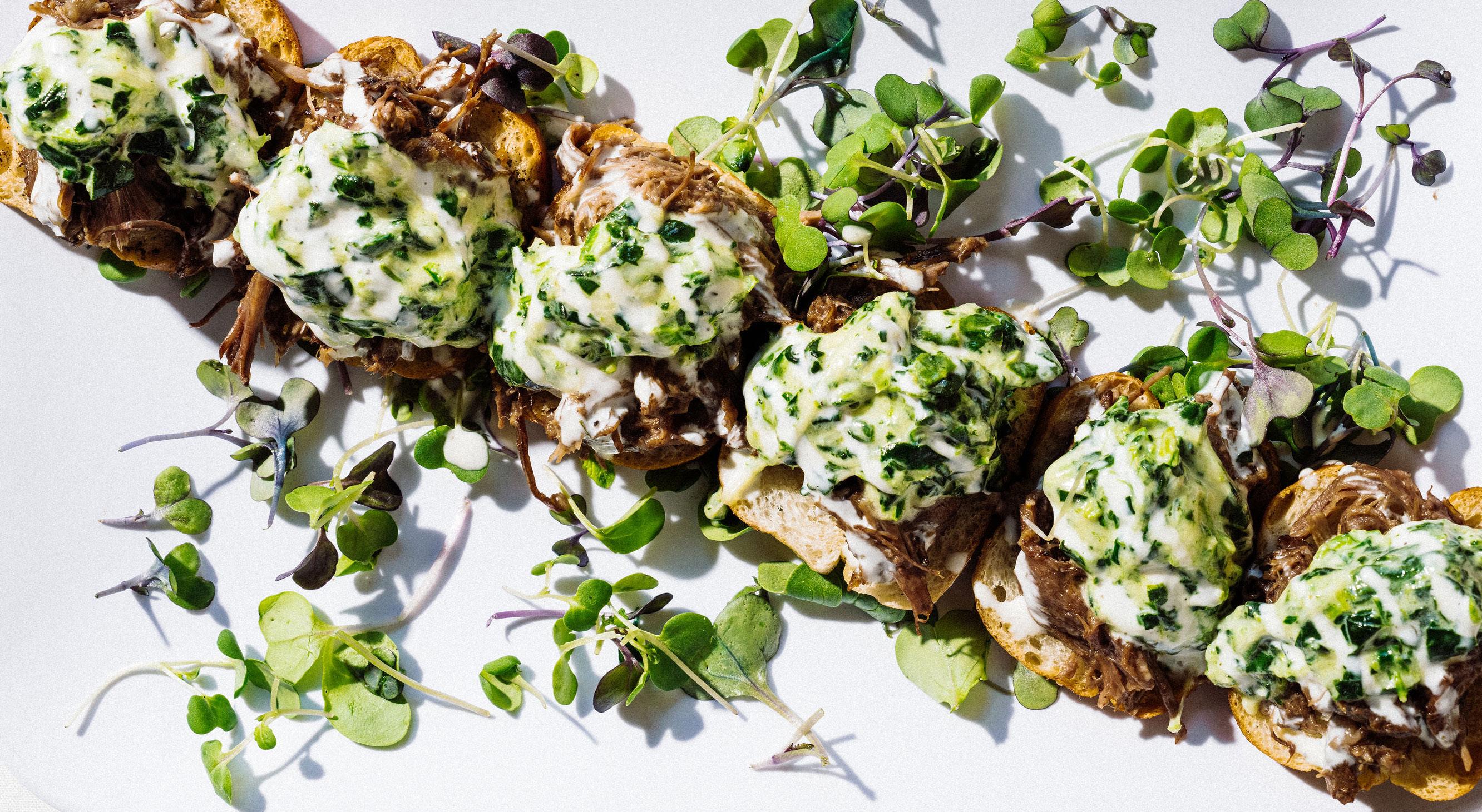 Beef Crostini shredded beef, rosemary demi-glace, horseradish creamed spinach