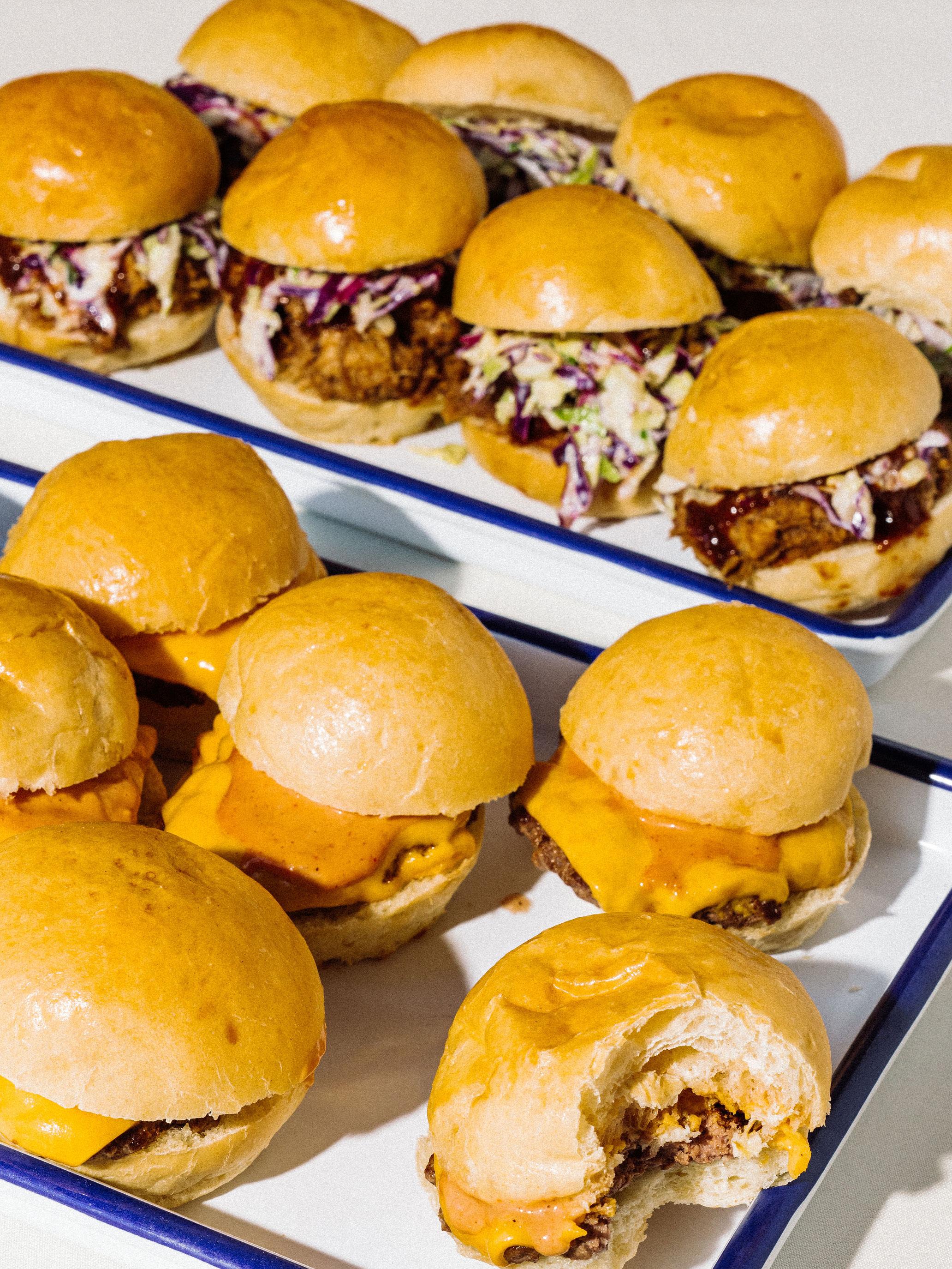 choice of bacon, taylor ham, sausage, vegan sausage or avocado, scrambled eggs, white american, slider bun