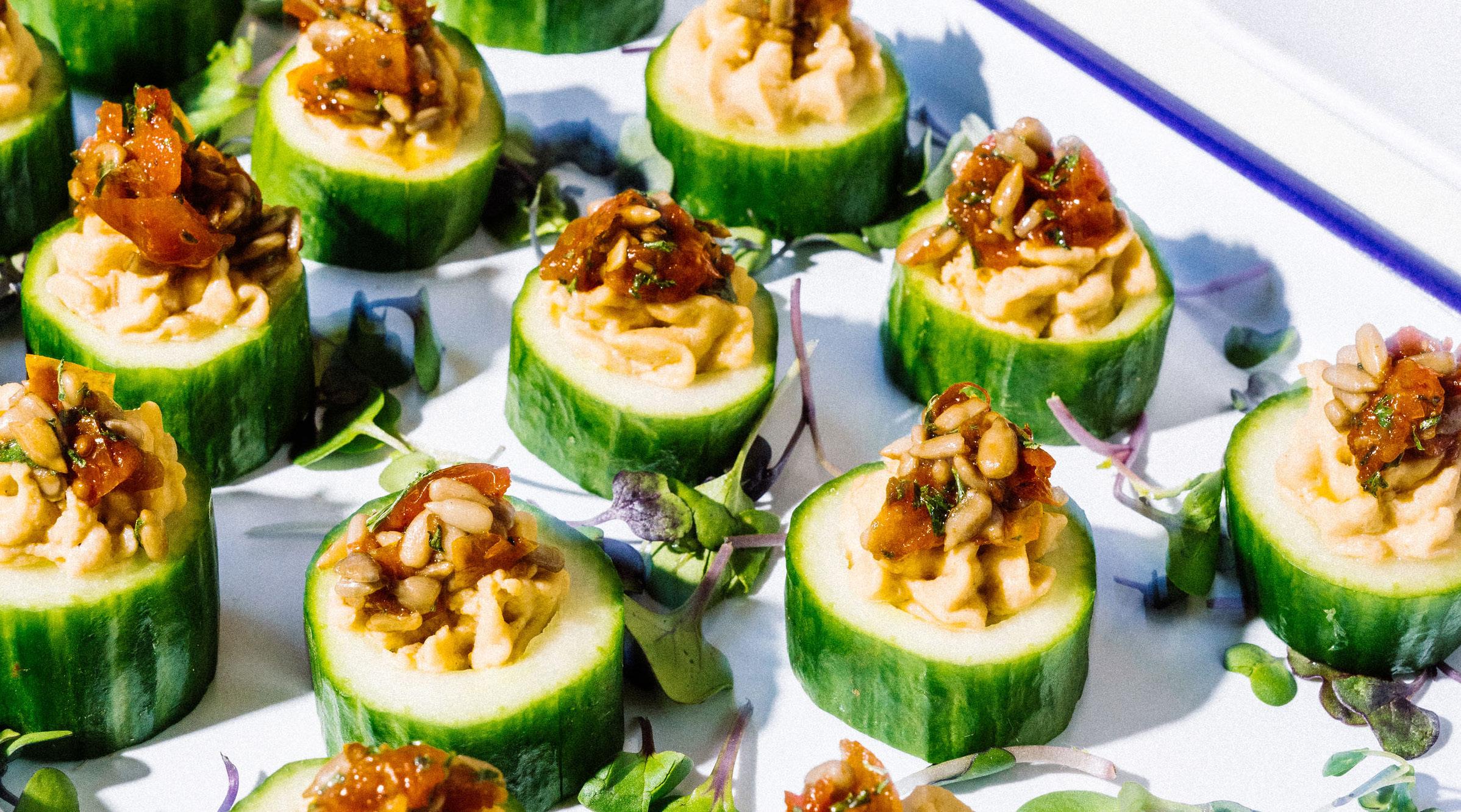 Hummus Cups cucumber cup, garlic hummus, herb oil