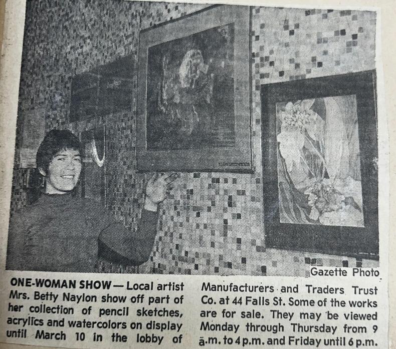 Betsy Naylon was a local prize-winning artist. She taught drawing and painting with the Niagara Falls Studio Group. She also was an instructor at Rosary Hill College. Much of her work depicted scenes from the past.