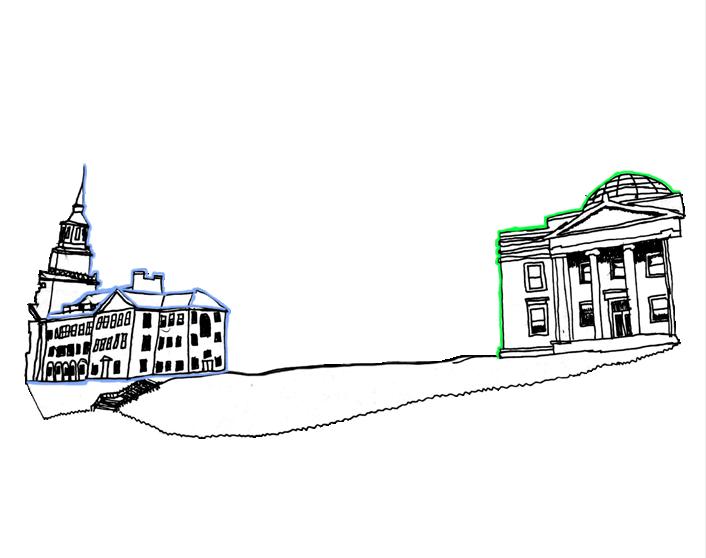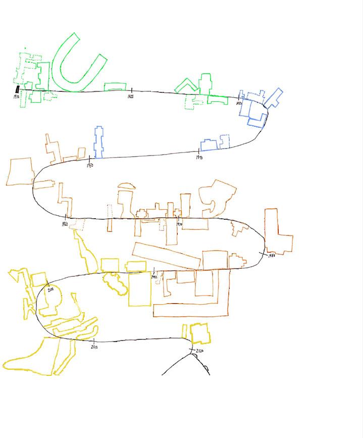 There have been many buildings, some of which are still here and some which have been demolished. These demolished buildings are represented by the dashed lines on the map. I choose to color code the buildings based on the time periods when they were built. Green were built before the 1930s, blue were built from 1930 to 1950, red were built from the 1950s to the 1970s, and yellow were built from the 1970s to the present.