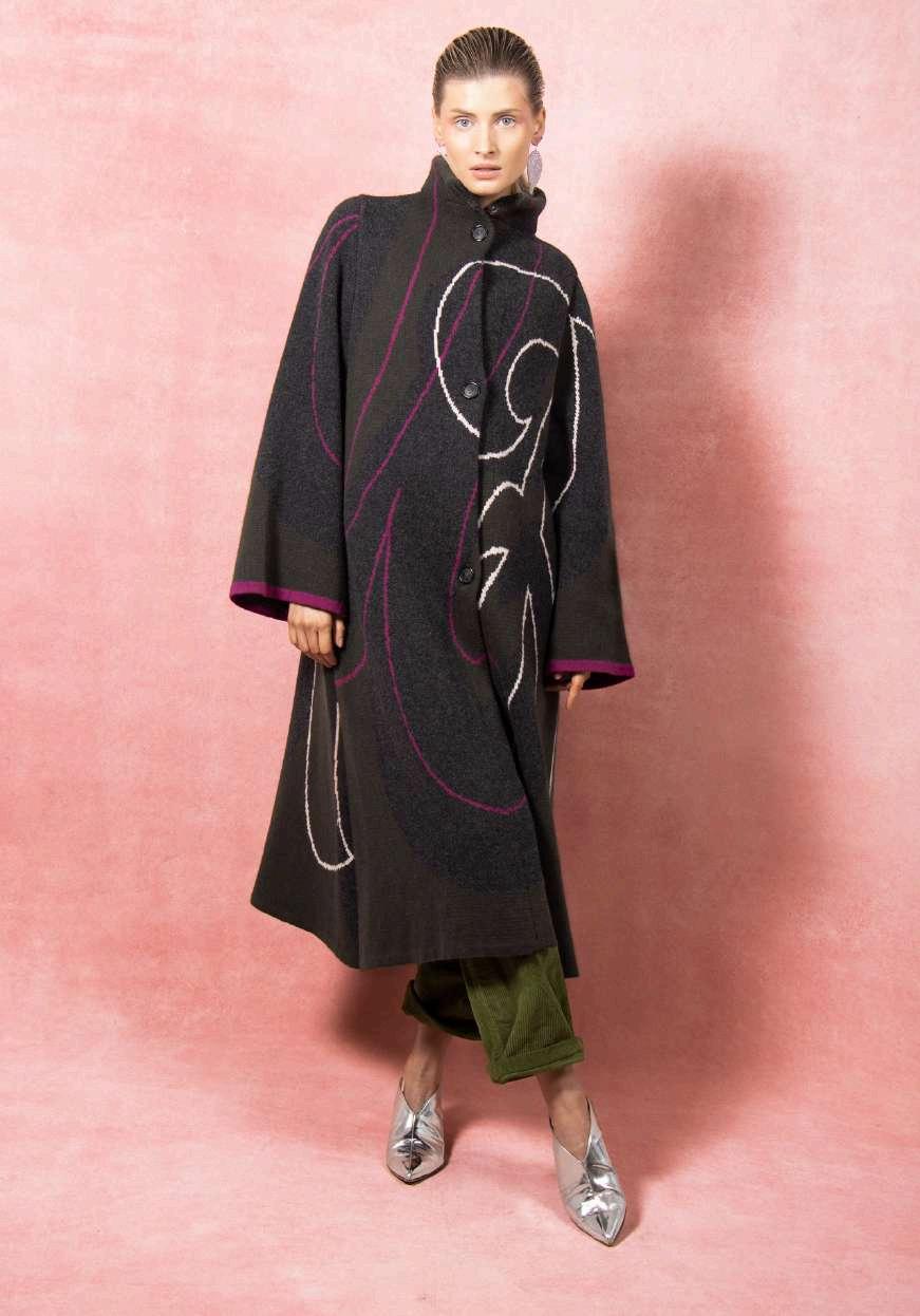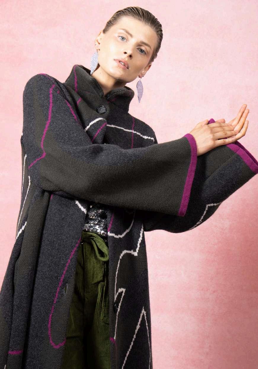 Concealedsnap-buttonfastening,sideentrypockets,jacquardknit graphicwithbirdseyeinside,ALinewithwithstructuredcollar Composition:100%purefinemerinomulesingfreeandRWScertified Twosizes-XS/S&M/L