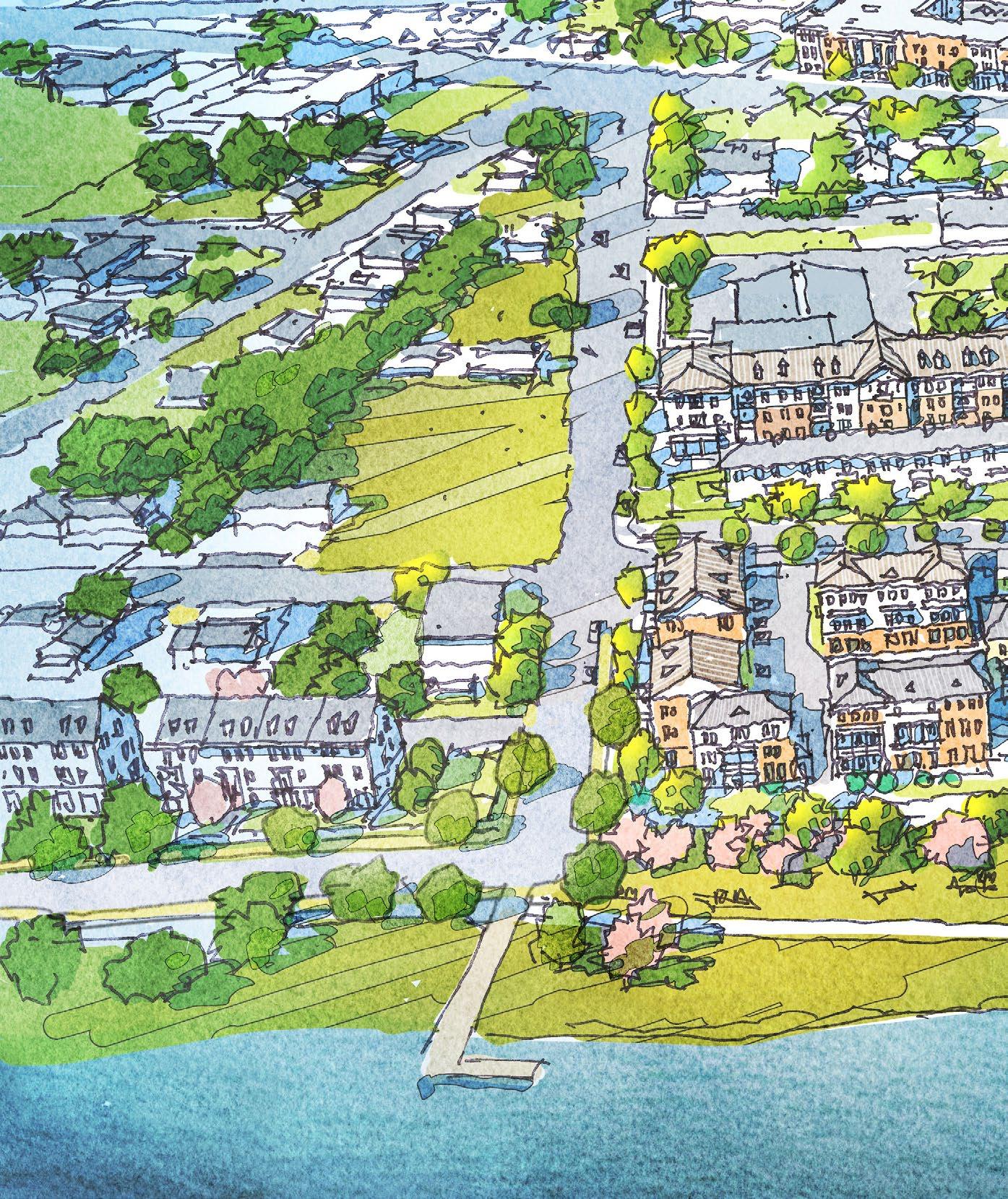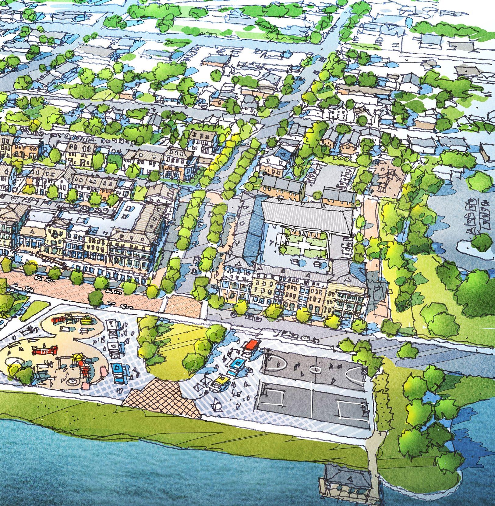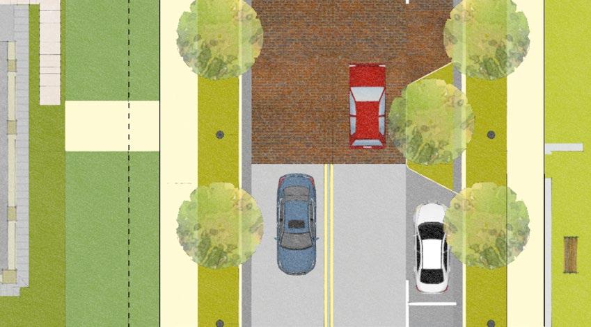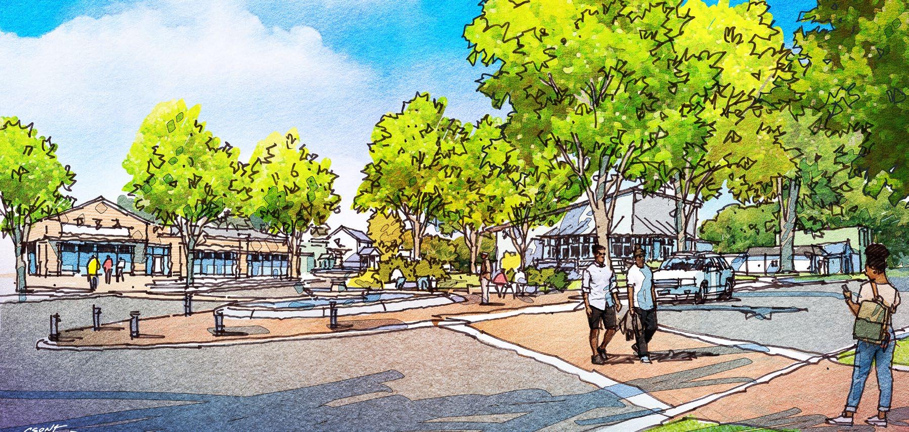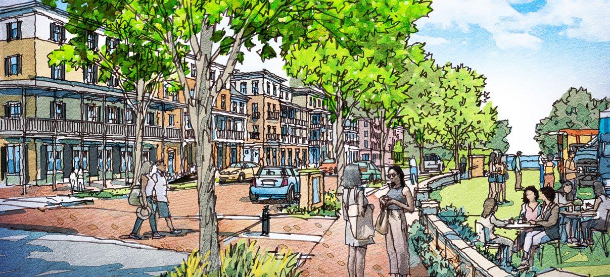 New streets on the redeveloped Trent Court site will be walkable, with sidewalks, street trees, and on-street parking for guests. Walt Bellamy Drive could be paved with special paving to slow cars and encourage pedestrians to access the riverfront park.