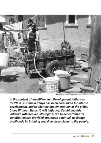 In the context of the Millennium Development Initiatives for 2030, Kisumu in Kenya has been earmarked for intense development, and to pilot the implementation of the global Cities Without Slums (CWS) initiative. Combining this initiative with Kenya’s strategic move to decentralize its constitution has provided enormous potential to change livelihoods by bringing social services closer to the people.