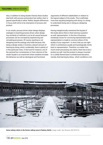 arguments of different stakeholders in relation to the topical subject of the studio. This is definitely more than equating designing with doing; it is doing to understand doing and, in doing so, designing processes.