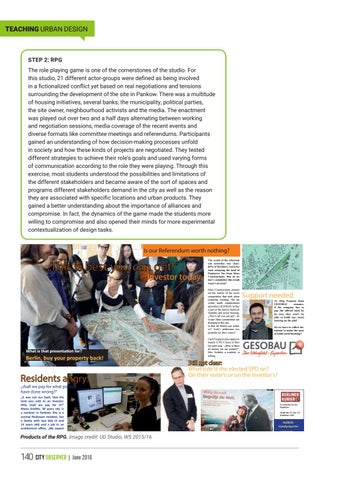 STEP 2: RPG The role playing game is one of the cornerstones of the studio. For this studio, 21 different actor-groups were defined as being involved in a fictionalized conflict yet based on real negotiations and tensions surrounding the development of the site in Pankow. There was a multitude of housing initiatives, several banks, the municipality, political parties, the site owner, neighbourhood activists and the media. The enactment was played out over two and a half days alternating between working and negotiation sessions, media coverage of the recent events and diverse formats like committee meetings and referendums. Participants gained an understanding of how decision-making processes unfold in society and how these kinds of projects are negotiated. They tested different strategies to achieve their role’s goals and used varying forms of communication according to the role they were playing. Through this exercise, most students understood the possibilities and limitations of the different stakeholders and became aware of the sort of spaces and programs different stakeholders demand in the city as well as the reason they are associated with specific locations and urban products. They gained a better understanding about the importance of alliances and compromise. In fact, the dynamics of the game made the students more willing to compromise and also opened their minds for more experimental contextualization of design tasks. Berlin 3