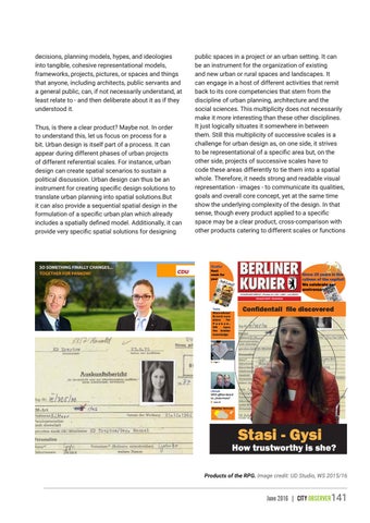public spaces in a project or an urban setting. It can be an instrument for the organization of existing and new urban or rural spaces and landscapes. It can engage in a host of different activities that remit back to its core competencies that stem from the discipline of urban planning, architecture and the social sciences. This multiplicity does not necessarily make it more interesting than these other disciplines. It just logically situates it somewhere in between them. Still this multiplicity of successive scales is a challenge for urban design as, on one side, it strives to be representational of a specific area but, on the other side, projects of successive scales have to code these areas differently to tie them into a spatial whole. Therefore, it needs strong and readable visual representation - images - to communicate its qualities, goals and overall core concept, yet at the same time show the underlying complexity of the design. In that sense, though every product applied to a specific space may be a clear product, cross-comparison with other products catering to different scales or functions
