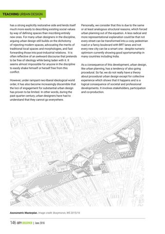 TEACHING URBAN DESIGN has a strong explicitly restorative side and lends itself much more easily to describing existing social values by way of defining spaces than inscribing entirely new ones. For many urban designers in the discipline, arguing urban design still builds on the dichotomy of rejecting modern spaces, advocating the merits of traditional local spaces and morphologies, and fast forwarding those into post-industrial relations. It is often reflective of an awkward discourse that pretends to be free of ideology while being laden with it. It seems almost impossible for anyone in the discipline to easily shake himself or herself free from this conflict. However, under rampant neo-liberal ideological world order, it has also become increasingly discernible that the loci of engagement for substantial urban design has proven to be limited. In other words, during the past quarter century, urban designers have had to understand that they cannot go everywhere.