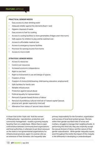 primary responsibility for the formation, organization and success of local-level protest groups. Women, within their gender-ascribed roles of wives and mothers, struggle to manage their neighbourhoods. In performing this third role, they also implicitly accept the sexual division of labour and the nature of their gender subordination. While gender inequality issues exist throughout the world, the impact of this inequity is felt differently in developing or underdeveloped