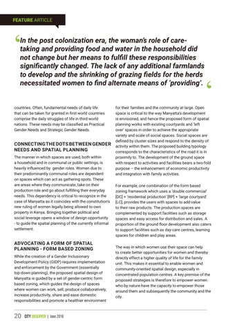 ADVOCATING A FORM OF SPATIAL PLANNING - FORM BASED ZONING While the creation of a Gender Inclusionary Development Policy (GIDP) requires implementation and enforcement by the Government (essentially top down planning), the proposed spatial design of Manyatta is guided by a set of gender-centric form based zoning, which guides the design of spaces where women can work, sell, produce collaboratively, increase productivity, share and ease domestic responsibilities and promote a healthier environment
