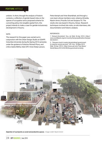 FEATURE ARTICLE undone. In short, through the analysis of historic contexts, a reflection of gender-based roles on the spaces of occupation and a proposed scheme for converting policy into tangible spatial form, this project intends to make a case for gender-inclusionary development in Kisumu.