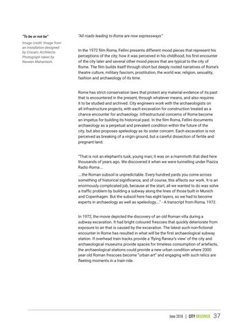“All roads leading to Rome are now expressways” In the 1972 film Roma, Fellini presents different mood pieces that represent his perceptions of the city; how it was perceived in his childhood, his first encounter of the city later and several other mood pieces that are typical to the city of Rome. The film builds itself through short but deeply rooted narratives of Rome’s theatre culture, military fascism, prostitution, the world war, religion, sexuality, fashion and archaeology of its time. Rome has strict conservation laws that protect any material evidence of its past that is encountered in the present, through whatever means, and also requires it to be studied and archived. City engineers work with the archaeologists on all infrastructure projects, with each excavation for construction treated as a chance encounter for archaeology. Infrastructural concerns of Rome become an impetus for building its historical past. In the film Roma, Fellini documents archaeology as a perpetual and prevalent condition within the future of the city, but also proposes speleology as its sister concern. Each excavation is not perceived as breaking of a virgin ground, but a careful dissection of fertile and pregnant land. “That is not an elephant’s tusk, young man; it was on a mammoth that died here thousands of years ago. We discovered it when we were tunnelling under Piazza Radio Roma…. ….the Roman subsoil is unpredictable. Every hundred yards you come across something of historical significance, and of course, this affects our work. It is an enormously complicated job, because at the start, all we wanted to do was solve a traffic problem by building a subway along the lines of those built in Munich and Copenhagen. But the subsoil here has eight layers, so we had to become experts in archaeology as well as speleology….” - A transcript from Roma, 1972. In 1972, the movie depicted the discovery of an old Roman villa during a subway excavation. It had bright coloured frescoes that quickly deteriorate from exposure to air that is caused by the excavation. The latest such non-fictional encounter in Rome has resulted in what will be the first archaeological subway station. If overhead train tracks provide a ‘flying flaneur’s view’ of the city and archaeological museums provide spaces for timeless consumption of artefacts, the archaeological stations could provide a new urban condition where 2000 year old Roman frescoes become “urban art” and engaging with such relics are fleeting moments in a train ride.