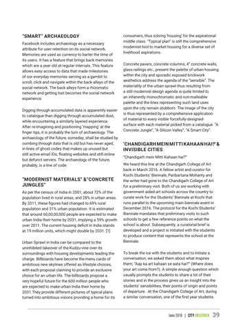‘CHANDIGARH MEIN MITTI KAHAAN HAI?’ & INVISIBLE CITIES “Chandigarh mein Mitti Kahaan hai?” We heard this line at the Chandigarh College of Art back in March 2016. A fellow artist and curator for Kochi Students’ Biennale, Paribartana Mohanty and the writer had gone to the Chandigarh College of Art for a preliminary visit. Both of us are working with government aided art schools across the country to curate work for the Students’ Biennale at Kochi that runs parallel to the upcoming main biennale event in December 2016. The protocol for the Kochi Students’ Biennale mandates that preliminary visits to such schools to get a few reference points on what the school is about. Subsequently, a curatorial brief is developed and a project is initiated with the students to produce content that represents the school at the Biennale. To break the ice with the students and to initiate a conversation, we asked them about what inspires them; “Aap ka art kahaan se aata hai?” (Where does your art come from?). A simple enough question which usually prompts the students to share a lot of their stories and in the process gives us an insight into the students’ sensibilities, their points of origin and points of departure. At the Chandigarh College of Art, during a similar conversation, one of the first year students
