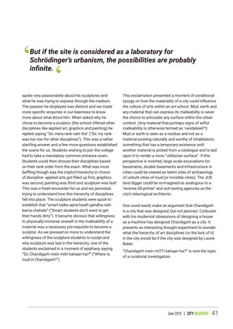 This exclamation presented a moment of conditional syzygy on how the materiality of a city could influence the culture of arts within an art school. Mud, earth and any material that can express its malleability is never the choice to articulate any surface within the urban context. (Any material that portrays signs of wilful malleability is otherwise termed as ‘vandalised’?) Mud or earth is seen as a residue and not as a material existing naturally and worthy of inhabitation; something that has a temporary existence until another material is picked from a catalogue and is laid upon it to render a more “utilitarian surface”. If this perspective is inverted, large scale excavations for basements, double basements and infrastructure in cities could be viewed as latent sites of archaeology of unbuilt cities of mud (or invisible cities). The JCB land digger could be re-imagined as analogous to a ‘reverse-3D-printer’ and soil testing agencies as the city’s teleological architects. One could easily make an argument that Chandigarh is a city that was designed, but not planned. Corbusier with his modernist obsessions of designing a house as a machine has designed Chandigarh as a city. It presents an interesting thought experiment to wonder what the hierarchy of art disciplines (or the lack of it) in the city would be if the city was designed by Laurie Baker. “Chandigarh mein miTTi kahaan hai?” is now the topic of a curatorial investigation.