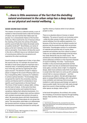 signifies vibrancy of places which in turn attracts people to cities. There is no absolute silence in human or natural habitation. The sense of sound is an involuntary action - unlike the other senses of sight, smell or touch we cannot withdraw from the auditory experience. It is because of this that we hear all ambient sounds, but perceive only the sounds through which we process information. Soundscapes consist of a combination of materials and activities and, of course, these materials and activities vary from culture to culture.5 Today we can safely add technology to the list which has vastly altered the way we create sound. The architecture critic Michael Kimmelman in his recent article addresses architects on the important character of sound in buildings. He writes - “sound may be invisible or only unconsciously perceived, but that doesn’t make it any less an architectural material than wood, glass, concrete, stone or light. It is shaped by design, albeit most architects rarely think much about it, except when their task is to come up with a pleasing concert hall or a raucous restaurant — and then acousticians are called in. We talk admiringly about green or energy-efficient buildings, with roof gardens, cross-ventilation and stairways that encourage residents to walk, because good design can aspire to improve public health. But we don’t talk nearly enough about how sound in these buildings, and in all the other spaces we design, make us feel.” 6 In the book Atmospheres, the architect, who evokes the immediacy of emotional response through building design, Peter Zumthor, writes on The Sound of a Space7: 5 David Howes, Sensing the City, accessed 3rd June 2016, http://www.david-howes.com/senses/sensing-the-city-lectureRMurraySchafer.htm 6 Micheal Kimmelman, 2015, NYTimes Arts, http://www.nytimes. com/interactive/2015/12/29/arts/design/sound-architecture. html?_r=1 7 Zumthor, Peter 2006, Atmospheres, Birkhauser, Basel, pg-29,30