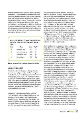 NOISIER, NOISIEST Pata hai bahut saal pehle yahan ek jungle hota tha, ghana bhara jungle, phir yahan ek sheher bangaya saaf suthre makaan seedhe raste sab kuch saleeqe se hone laga, par jis din jungle kata uss din parindou ka ek jhund yahan se hamesha ke liye udd gaya ... [ You know, some years ago there used to be a forest here, a thick green forest, then one day a city got built here, neat and clean homes, straight roads, everything was organized; but the day the forest was cut, a flock of birds flew forever from here...]. These lyrics from the Bollywood film Rockstar (2011) epitomize the process of urbanization. The discussions about cities, a little more than two decades ago, are replete with the effervescent bird songs. The loss of natural habitat is to such a great extent that the sight of common birds has become rare. The first casualty of desensitized urbanization