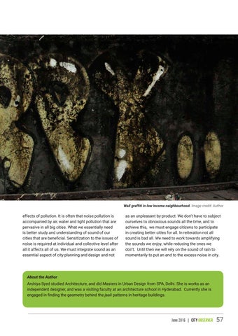 effects of pollution. It is often that noise pollution is accompanied by air, water and light pollution that are pervasive in all big cities. What we essentially need is better study and understanding of sound of our cities that are beneficial. Sensitization to the issues of noise is required at individual and collective level after all it affects all of us. We must integrate sound as an essential aspect of city planning and design and not