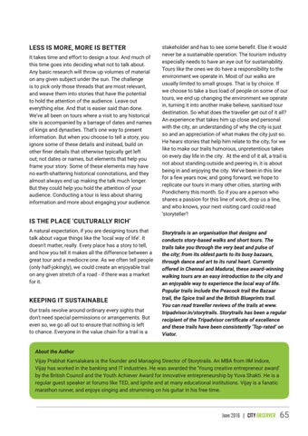 stakeholder and has to see some benefit. Else it would never be a sustainable operation. The tourism industry especially needs to have an eye out for sustainability. Tours like the ones we do have a responsibility to the environment we operate in. Most of our walks are usually limited to small groups. That is by choice. If we choose to take a bus load of people on some of our tours, we end up changing the environment we operate in, turning it into another make believe, sanitised tour destination. So what does the traveller get out of it all? An experience that takes him up close and personal with the city, an understanding of why the city is just so and an appreciation of what makes the city just so. He hears stories that help him relate to the city, for we like to make our trails humorous, unpretentious takes on every day life in the city. At the end of it all, a trail is not about standing outside and peering in, it is about being in and enjoying the city. We’ve been in this line for a few years now, and going forward, we hope to replicate our tours in many other cities, starting with Pondicherry this month. So if you are a person who shares a passion for this line of work, drop us a line, and who knows, your next visiting card could read ‘storyteller’! Storytrails is an organisation that designs and conducts story-based walks and short tours. The trails take you through the very beat and pulse of the city; from its oldest parts to its busy bazaars, through dance and art to its rural heart. Currently offered in Chennai and Madurai, these award-winning walking tours are an easy introduction to the city and an enjoyable way to experience the local way of life. Popular trails include the Peacock trail the Bazaar trail, the Spice trail and the British Blueprints trail. You can read traveller reviews of the trails at www. tripadvisor.in/storytrails. Storytrails has been a regular recipient of the Tripadvisor certificate of excellence and these trails have been consistently ‘Top-rated’ on Viator.