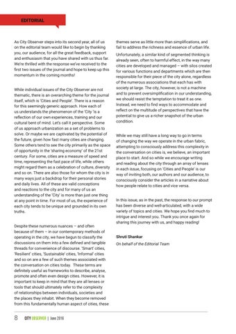 themes serve as little more than simplifications, and fail to address the richness and essence of urban life. Unfortunately, a similar kind of segmented thinking is already seen, often to harmful effect, in the way many cities are developed and managed – with silos created for various functions and departments which are then responsible for their piece of the city alone, regardless of the numerous associations that each has with society at large. The city, however, is not a machine and to prevent oversimplification in our understanding, we should resist the temptation to treat it as one. Instead, we need to find ways to accommodate and reflect on the multitude of perspectives that have the potential to give us a richer snapshot of the urban condition. While we may still have a long way to go in terms of changing the way we operate in the urban fabric, attempting to consciously address this complexity in the conversation on cities is, we believe, an important place to start. And so while we encourage writing and reading about the city through an array of lenses in each issue, focusing on ‘Cities and People’ is our way of inviting both, our authors and our audience, to consciously consider the articles in a narrative about how people relate to cities and vice versa. In this issue, as in the past, the response to our prompt has been diverse and well-articulated, with a wide variety of topics and cities. We hope you find much to intrigue and interest you. Thank you once again for sharing this journey with us, and happy reading! Shruti Shankar On behalf of the Editorial Team