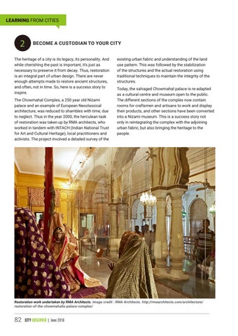 existing urban fabric and understanding of the land use pattern. This was followed by the stabilization of the structures and the actual restoration using traditional techniques to maintain the integrity of the structures. Today, the salvaged Chowmahal palace is re-adapted as a cultural centre and museum open to the public. The different sections of the complex now contain rooms for craftsmen and artisans to work and display their products, and other sections have been converted into a Nizami museum. This is a success story not only in reintegrating the complex with the adjoining urban fabric, but also bringing the heritage to the people.