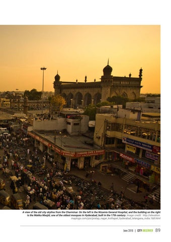 A view of the old city skyline from the Charminar. On the left is the Nizamia General Hospital, and the building on the right is the Makka Masjid, one of the oldest mosques in Hyderabad, built in the 17th century. Image credit: http://elevation. maplogs.com/poi/pratap_nagar_kothapet_hyderabad_telangana_india.168.html