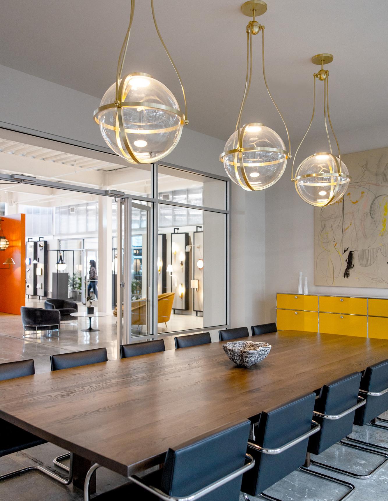 Not unlike the high-concept spaces our lights most often hang in, our office environment has a unifying theme throughout that is a distinct reflection of our perspective and complement to the streamlined quality of our fixtures. Functional yet comfortable with utilitarian materials and pops of color throughout, the style can best be described as industrial meets modern.