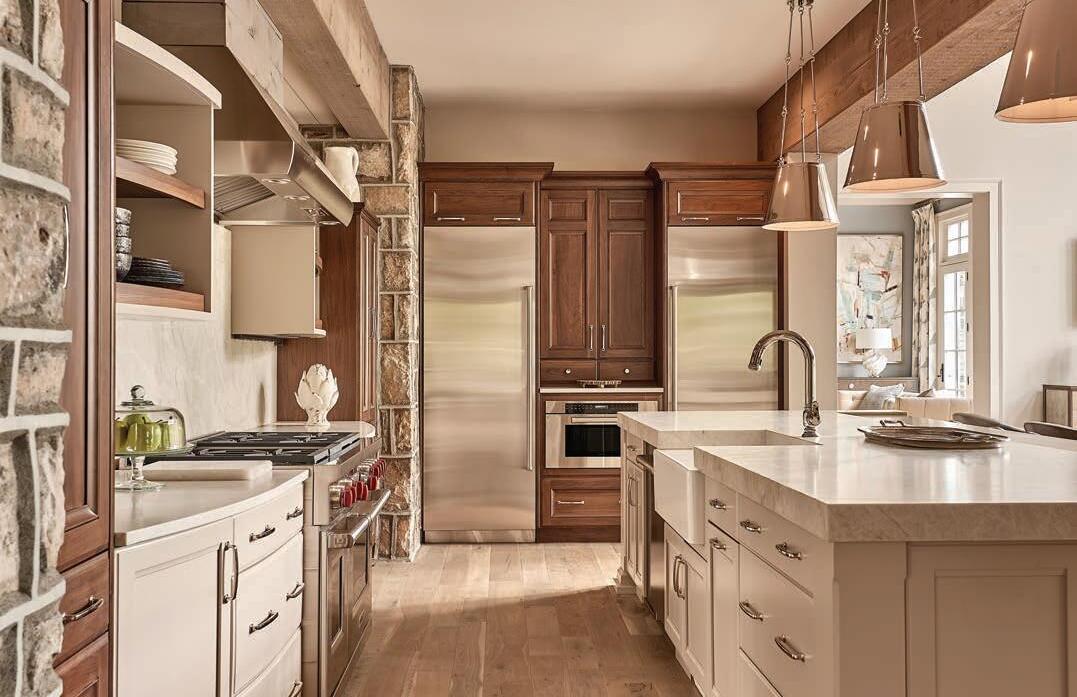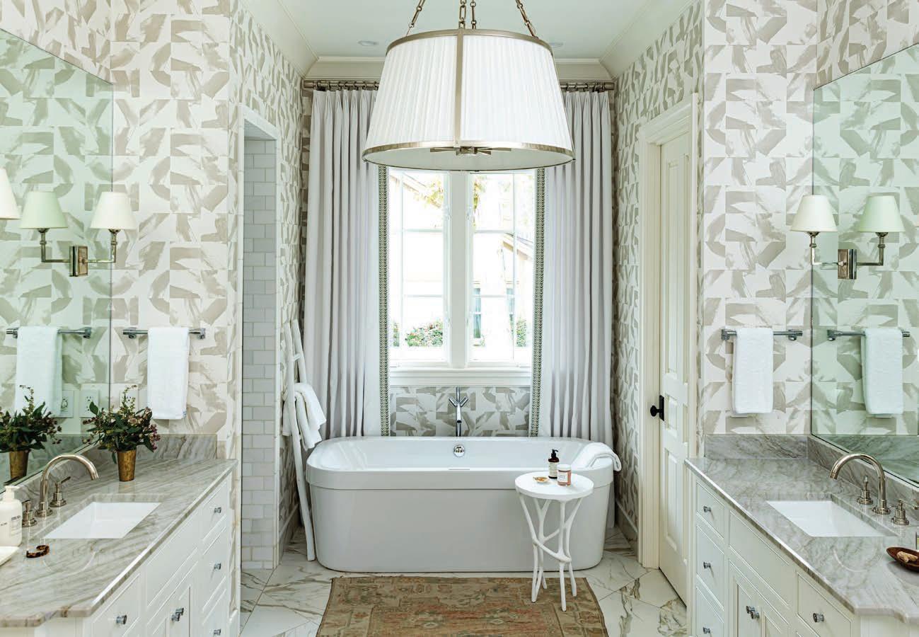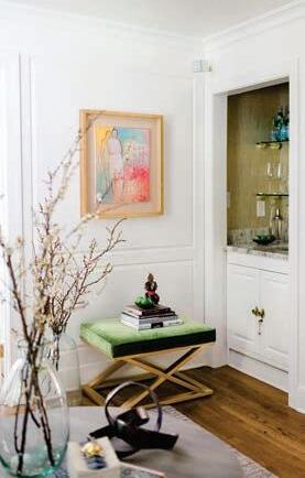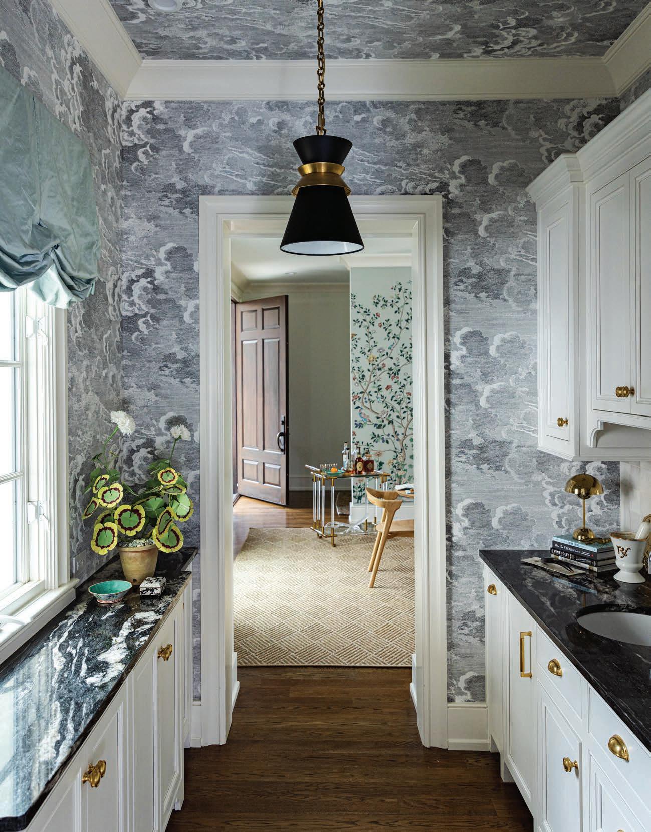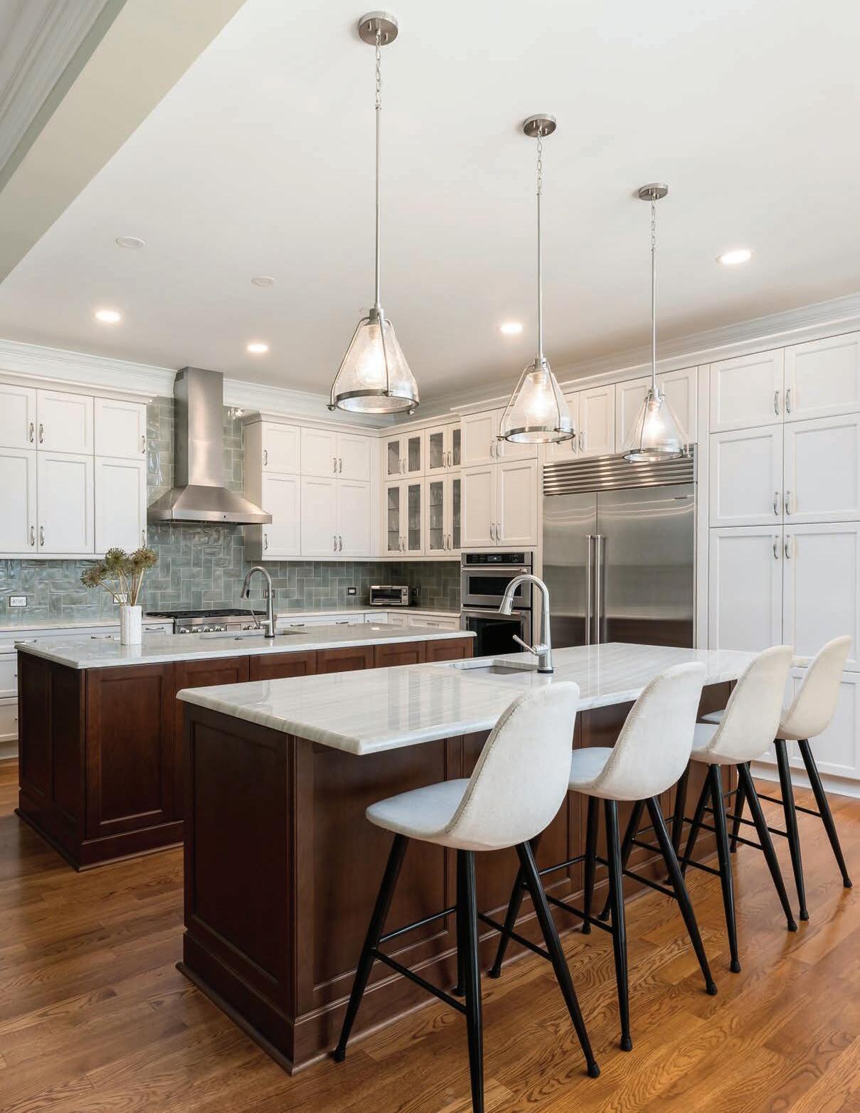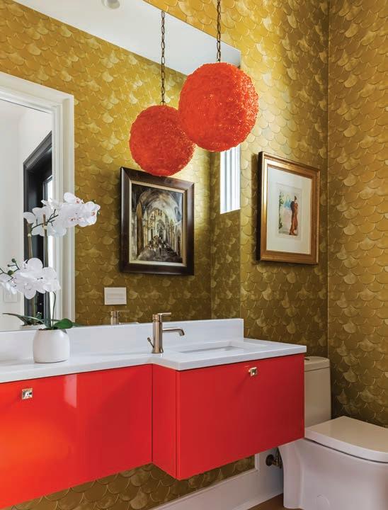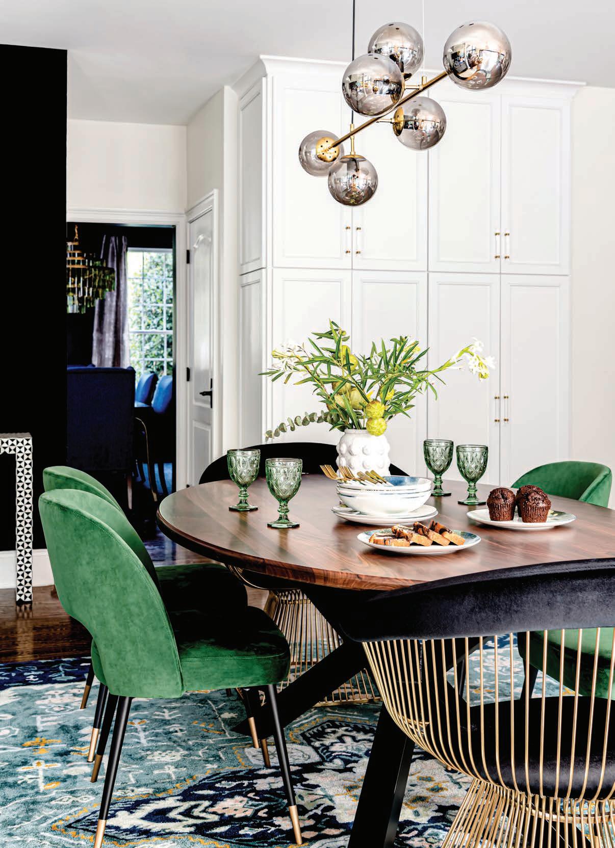 powder bathroom and then accented with dramatic lighting in both rooms. In the kitchen, I like to keep it clean: honed marble on the kitchen countertops and walnut on the island top, neutral cabinets, elegant yet unique lighting, and gold hardware (gold faucets and fixtures are still a hot color combination). My color pop in the kitchen comes from fresh flowers or greenery found at local farmers markets.