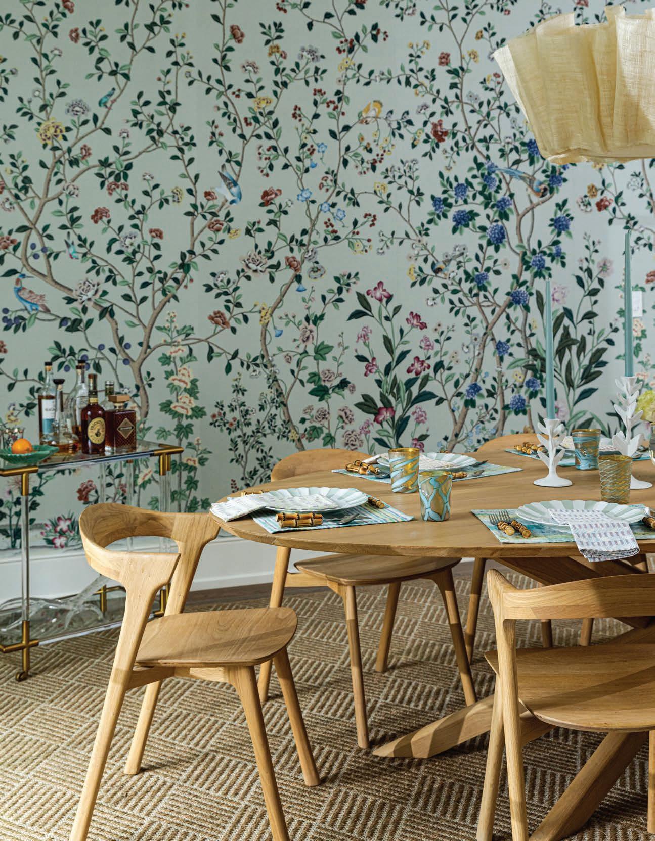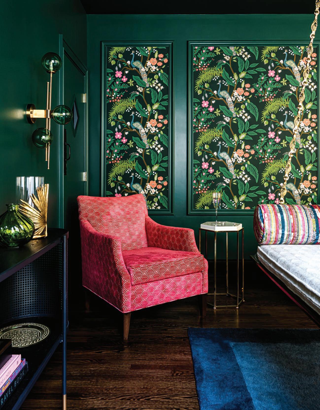 Next, consider the walls. I’m a fan of experimenting with wall color to define the mood of a room. For example, most of the walls in my home are quite neutral, but in my dining room, I went bold with black walls. I found a fun wallpaper for the