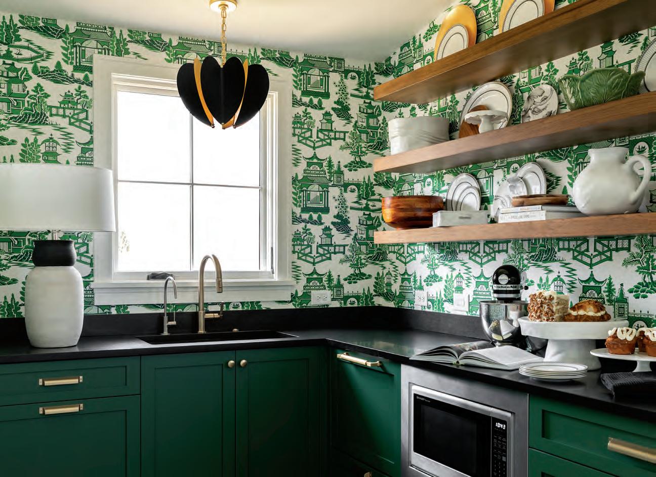 While these cabinet-filled rooms can complement the kitchen and adjoining rooms, because a scullery is often visible from the kitchen, I love creating something special with a dramatic contrasting paint color or wallcovering, or even a scene-stealing tile—an alter ego of sorts. If bold is what you’re after, choose a patterned wallcovering in a daring color like kelly green to line the walls. Attach floating shelves to display the prettiest serving pieces while storing more functional pieces