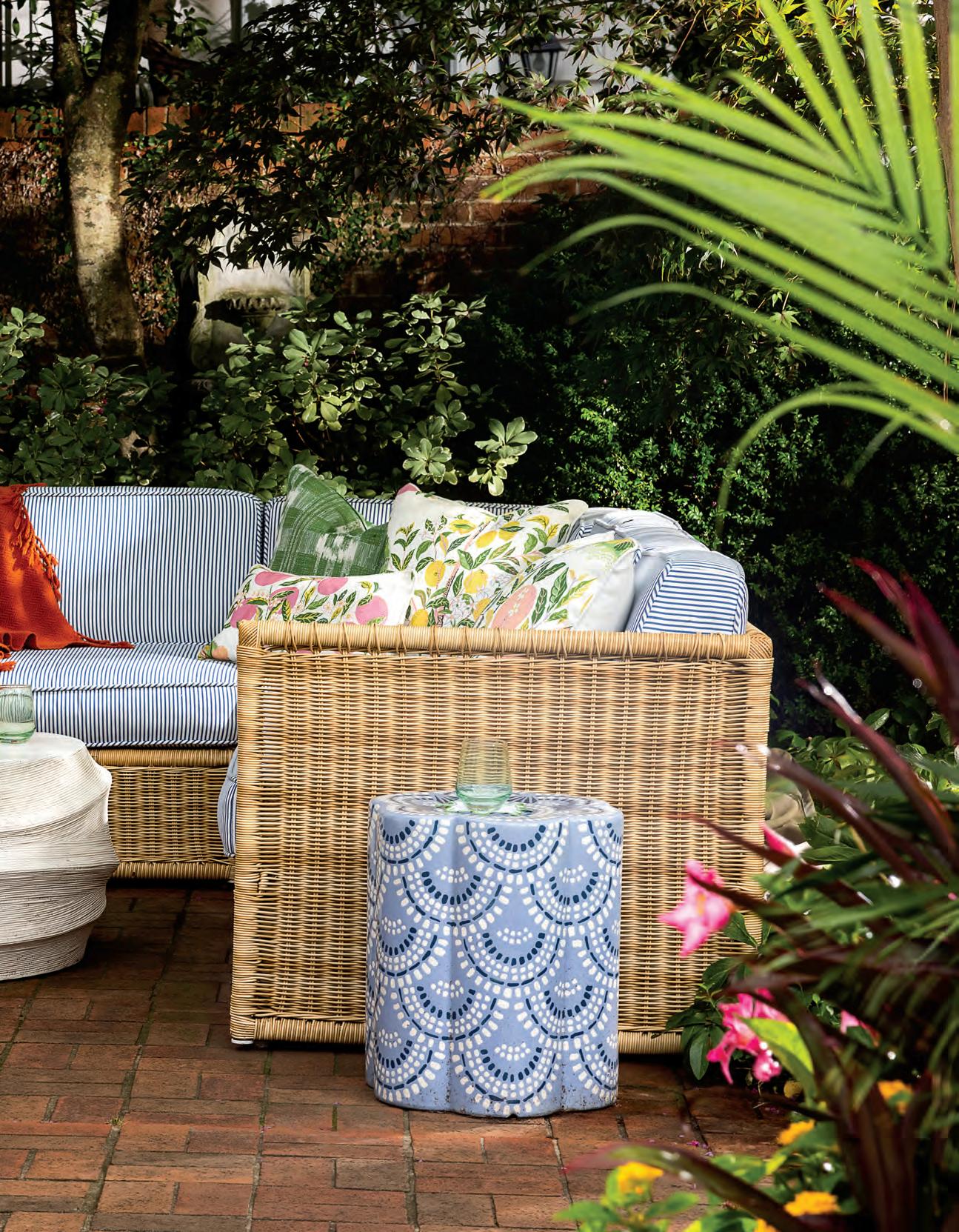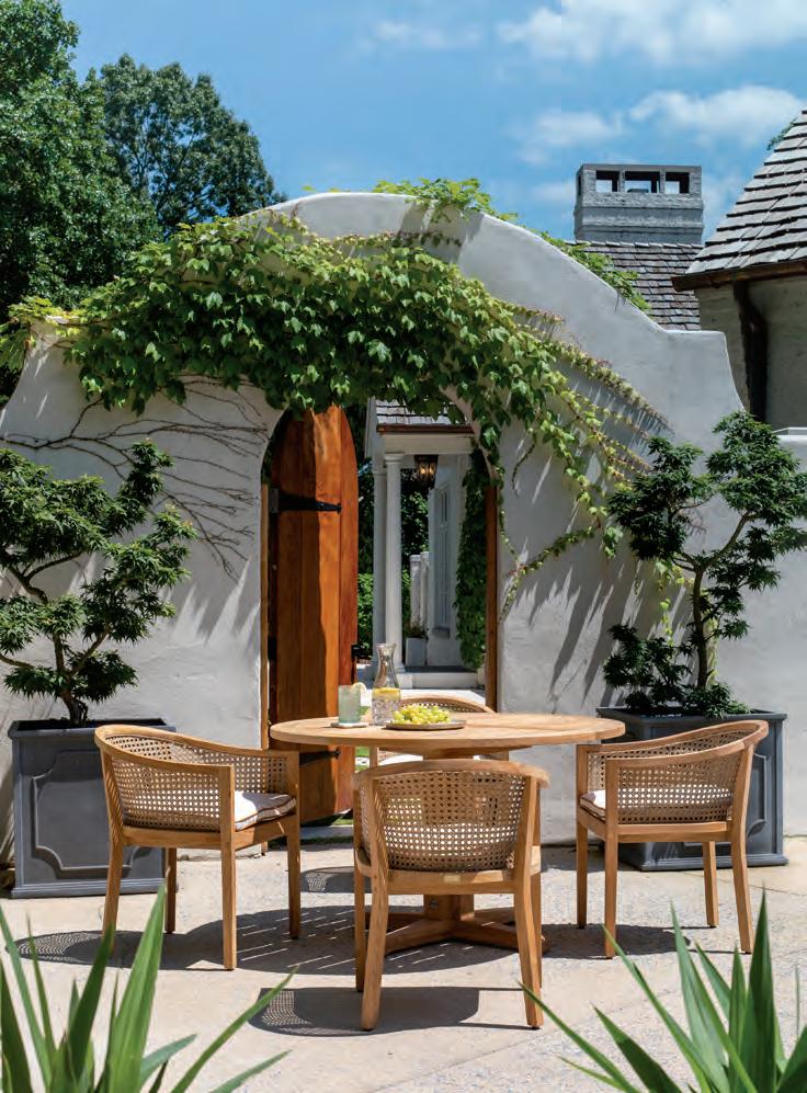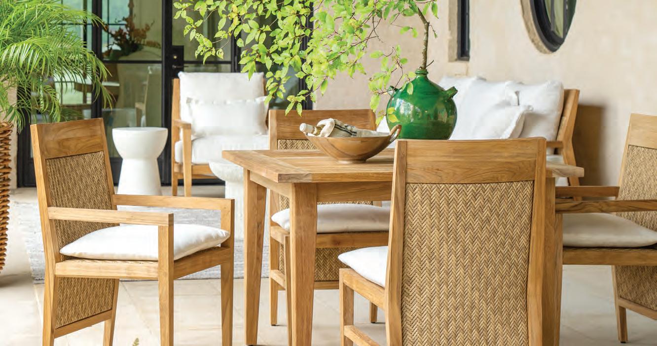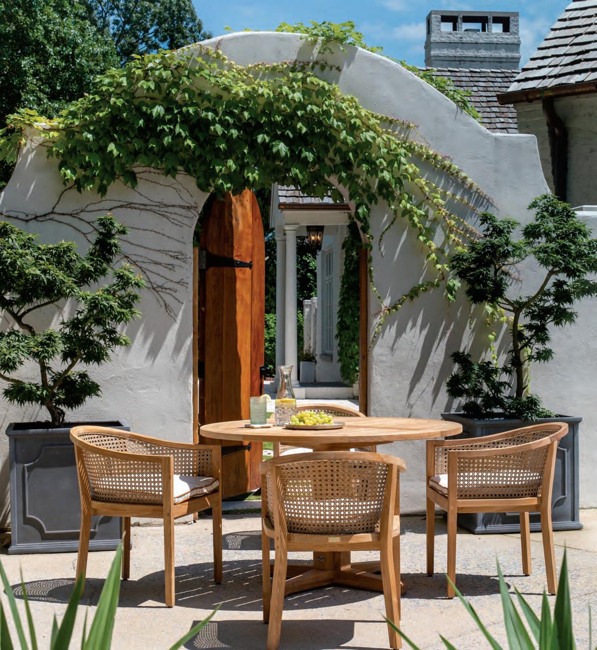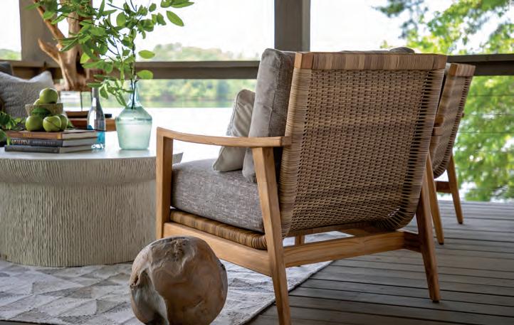THE PATIO, the porch, and the garden seating area—these are the transitional spaces that seamlessly blend the lines between indoors and out, merging interior design with nature. One of the biggest challenges of crafting the perfect outdoor living area is creating a space as durable as it is beautiful. With the hot Southern sun, high humidity, and unpredictable environmental elements like wind, hail, and rain that put outdoor furnishings to the test, Summer Classics answers the call with their signature N-Dura resin wicker and sustainably harvested teak collections in their newest curation, Timeless Forest.