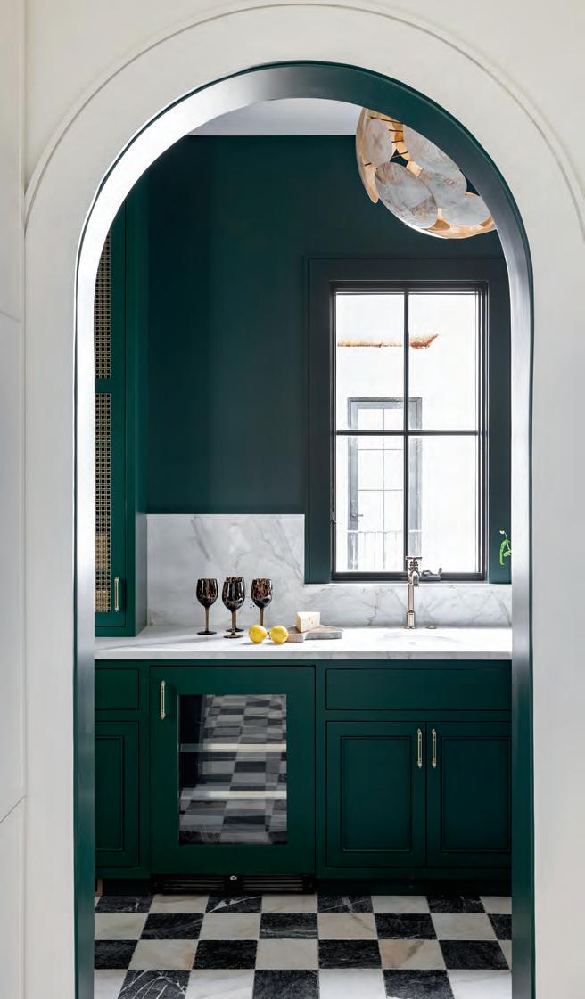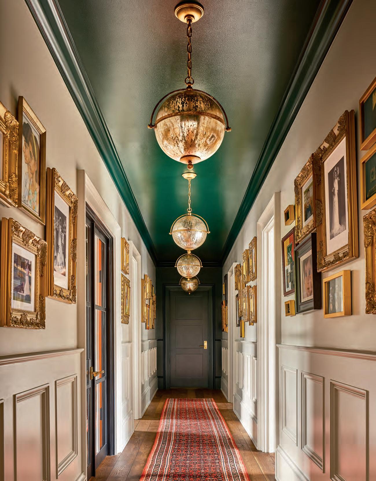 Moody achieved her goal of beautiful, colorful spaces that seamlessly play off each other by weaving similar paints, complementary colorways, and fabrics throughout multiple rooms. The hallway paint down the ceiling and on the end walls of the hallway, for example, is the same paint she used on the cabinetry in the bar area. Runner: Textura. Paint: Sherwin-Williams Dard Hunter Green.