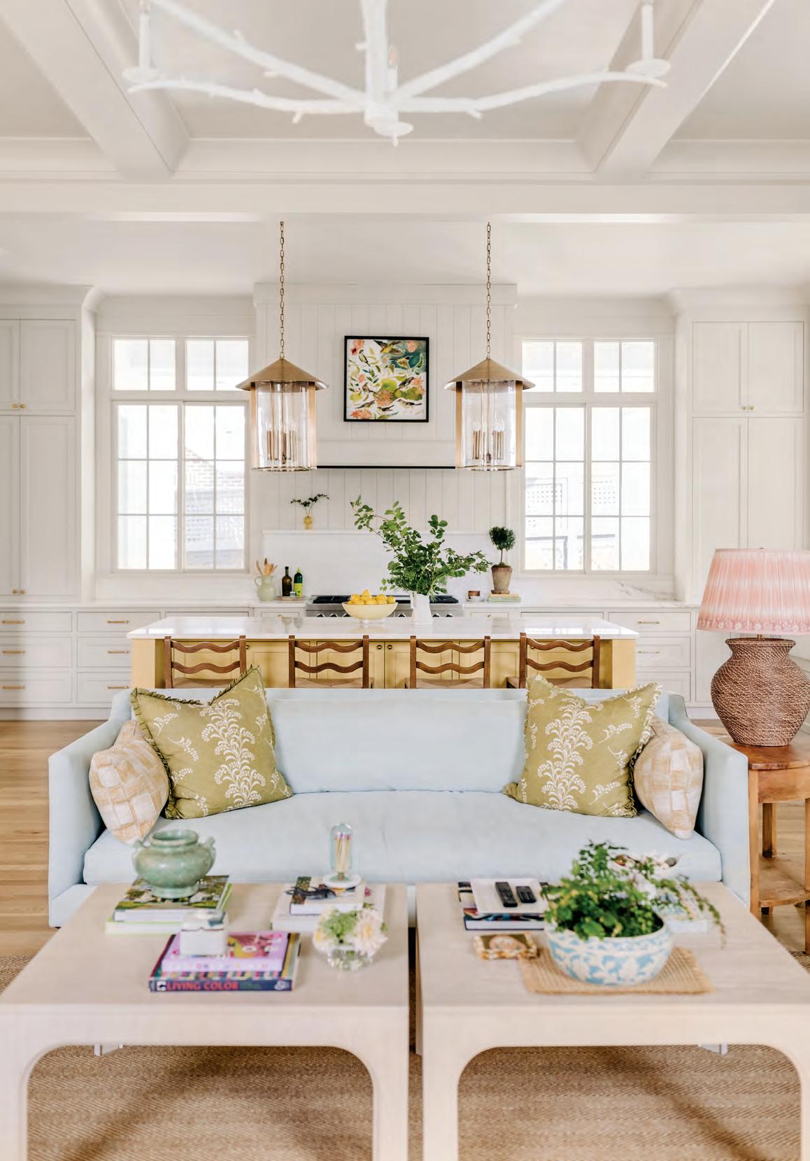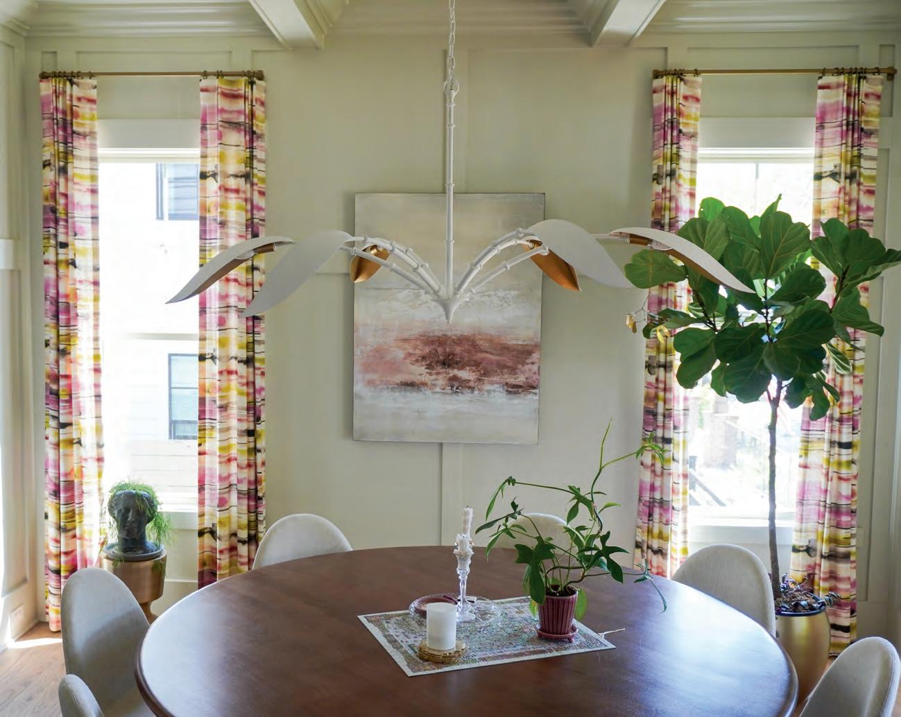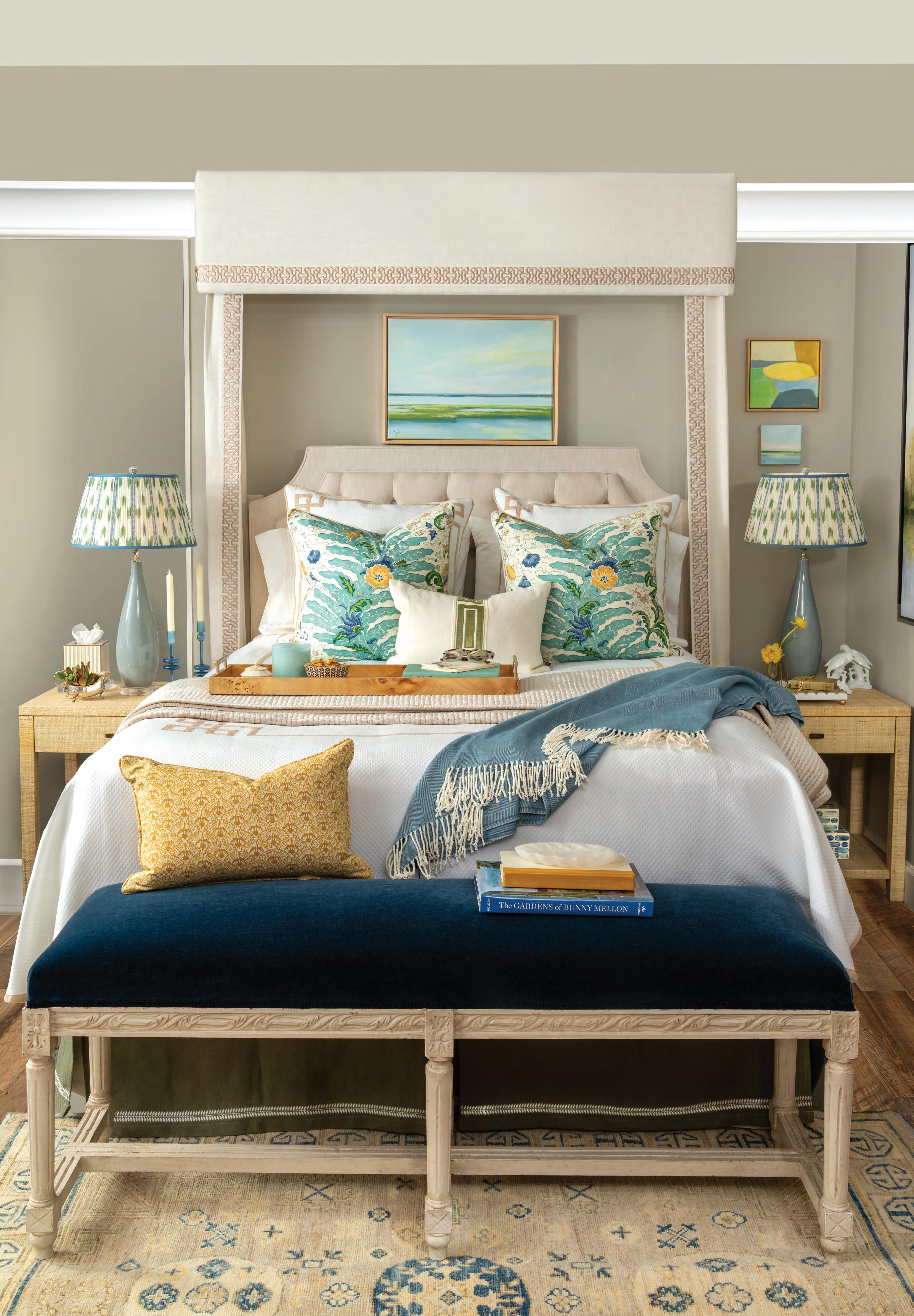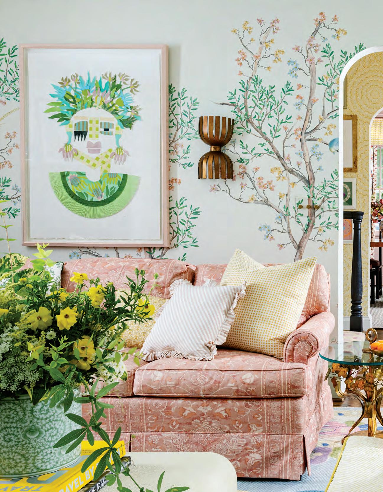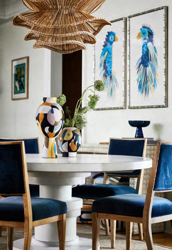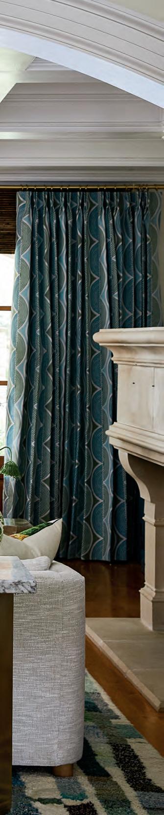 one place to create cohesion and continuity.” Drapery fabric: Emdee. Lumbar pillow fabric: Manuel Canovas. Artwork: Kristen Groner.