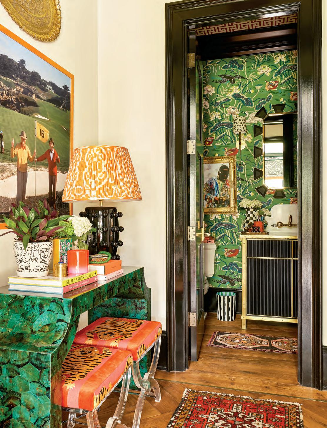 “Juxtaposition and a touch of irreverence are my jam,” says Moody. “You see that play out in the powder room with the timeless Lotus Garden wallpaper by Schumacher paired with rapper Biggie Smalls in an antique frame for contrast and an unexpected touch.” Wallpaper: Schumacher. Sconce shades: Brunschwig & Fils. Mirror: Celerie Kemble. Photo in hall: Slim Aarons. Stool fabric: Schumacher.