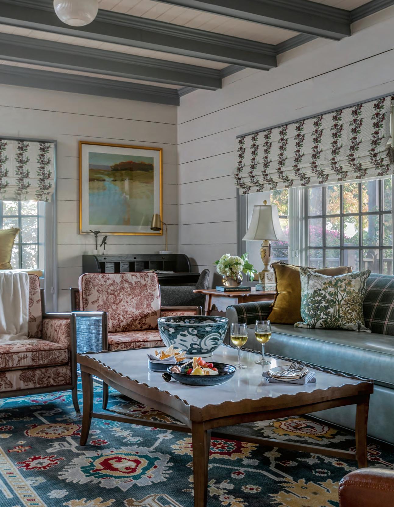 The eighty-four guest rooms and suites, ranging from one bedroom to seven, were meticulously renovated and redesigned by Lucas and her team. Floor-to-ceiling draperies of subdued florals and hunting dogs—embodied by Schumacher’s beloved Georgia Wildflowers and Pointers prints—dot the cottages, paired with rich leather, soft velvets, and timeless prints.