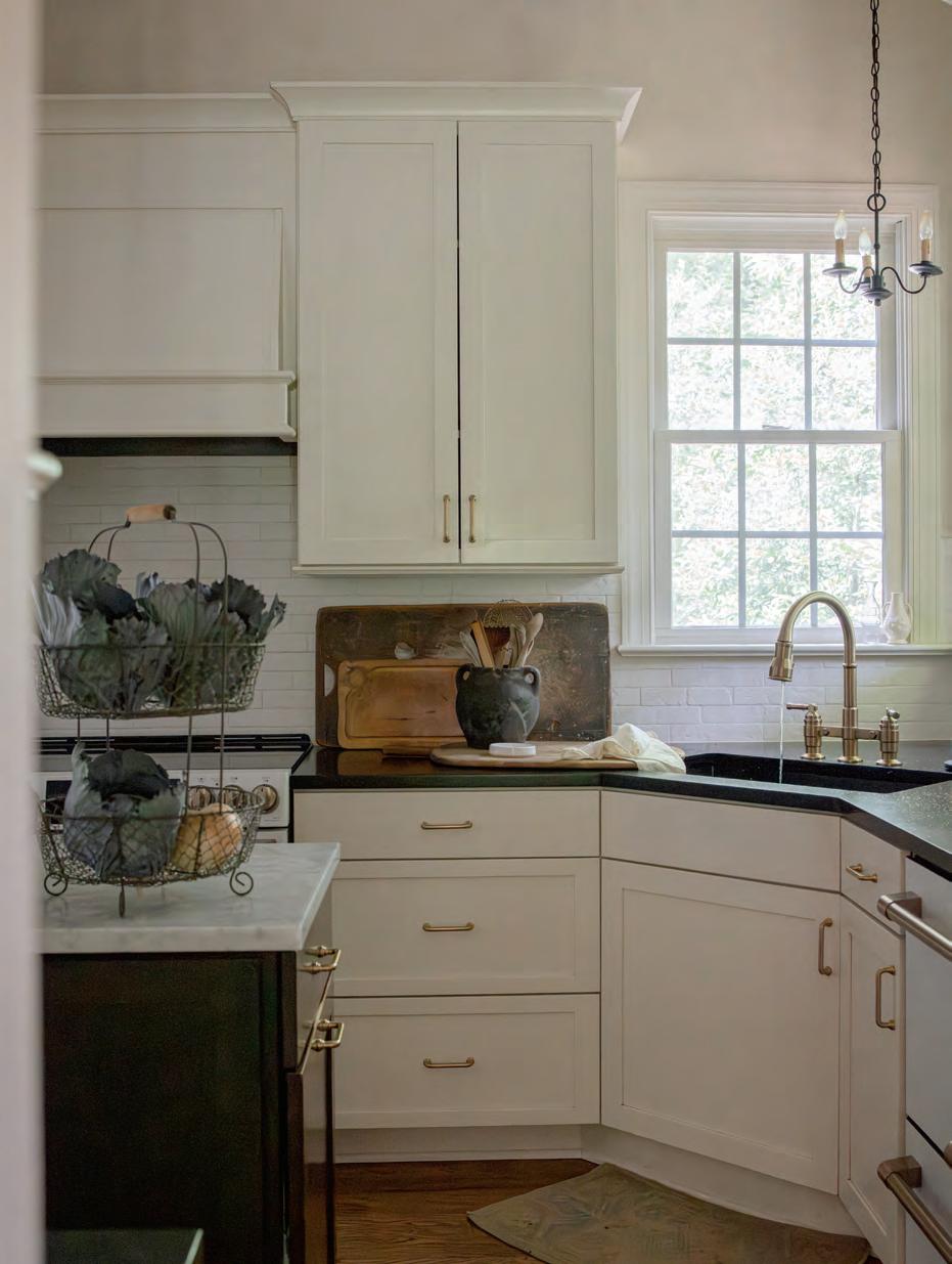 A big kitchen required a lot of cabinets, so Day kept them simple and used a stock cabinetry color, “allowing us to put more money into the lighting and plumbing fixtures—the things that add character to the space,” she says.