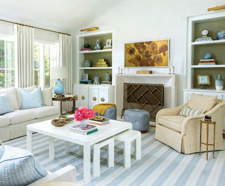 They enlisted the keen eye of designer Cat French to turn their new house into a retirement haven. The couple’s deep connection to art and family heirlooms paired naturally with French’s confident use of color and her background in historic preservation. “The home had great natural light with many architectural details we could weave into the design,” French says. “But it was outdated, with a bland palette. The clients had artistic tastes, favoring a colorful, Art Deco–inspired design with luxe fabrics, symmetrical pattern, and great craftsmanship.”