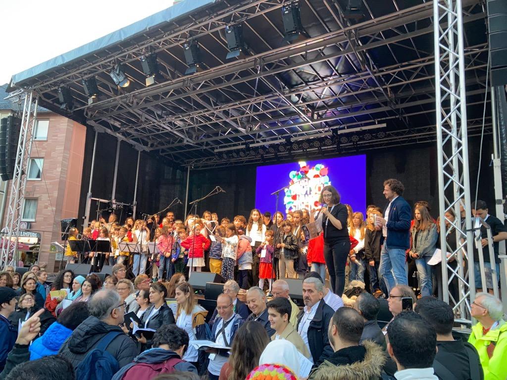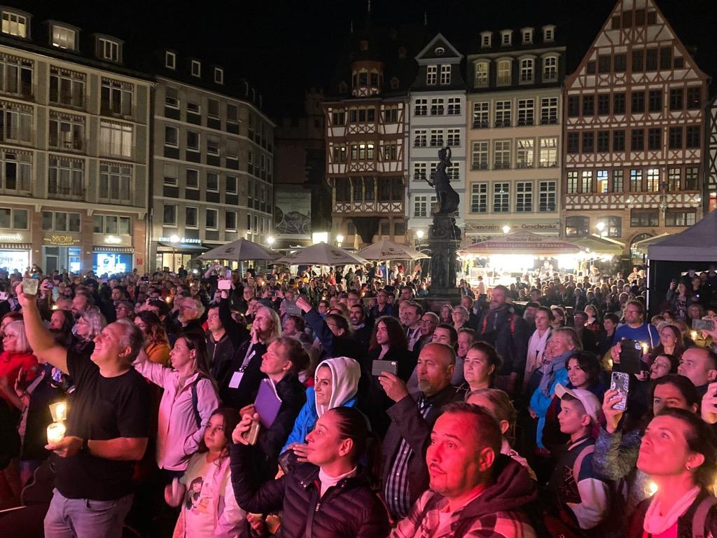Rund 3.500 Frankfurterinnen und Frankfurter unterschiedlichster Kulturen haben sich am 3. Oktober 2023 nicht von dem schlechten Wetter und kühlen Temperaturen abhalten lassen, um gemeinsam den Tag der Deutschen Einheit auf dem Römerberg vor dem Rathaus zu singen und mitzufeiern. Mit Kerzen in der Hand, einer Live-Band und der Unterstützung verschiedener Chöre aus Frankfurt starte die Veranstaltung als Teil der überregionalen Initiative „3 . Oktober – Deutschland singt und klingt“ auf dem Römerberg. Den Auftakt machte der Auftritt mit über 50 Kindern und Jugendlichen auf der Bühne und ähnlich vielen Erwachsenen vor der Bühne der Projektchor Bosporus. An mehr als 130 Orten in ganz Deutschland sind Menschen zusammengekommen, um gemeinsam zum Tag der Deutschen Einheit Lieder anzustimmen. Deutschlandweit wurden zur selben Zeit insgesamt zehn Lieder gesungen, darunter „Oh happy Day – Jesus washed my sins away“, das israelische Volkslied „Hevenu Shalom Alechem“ und viele mehr. Neben der gesanglichen Untermalung gab es auch ein Gespräch mit dem Zeitzeugen mit Pfr. Martin Henker und Politikern, unteranderem mit einem Grußwort von Oberbürgermeister Mike Josef.
